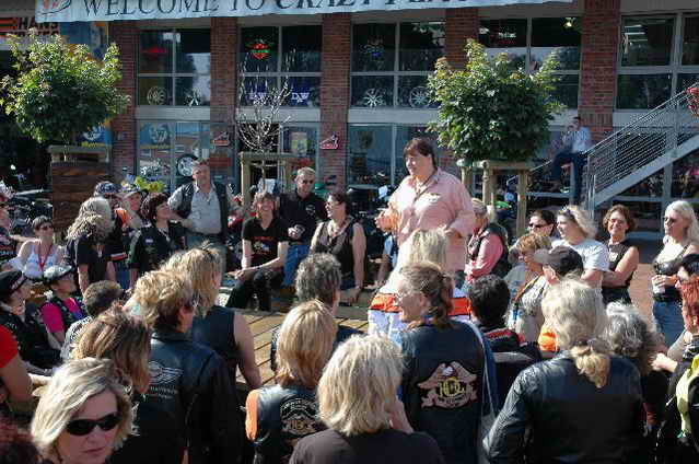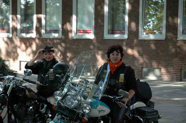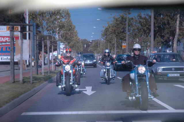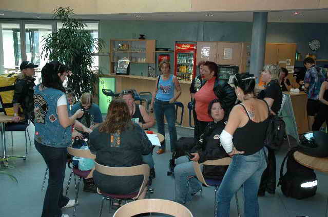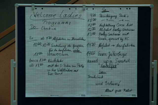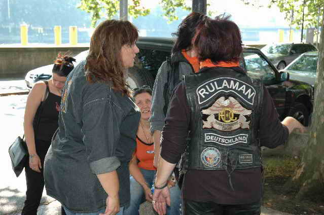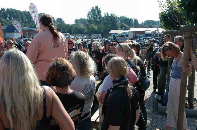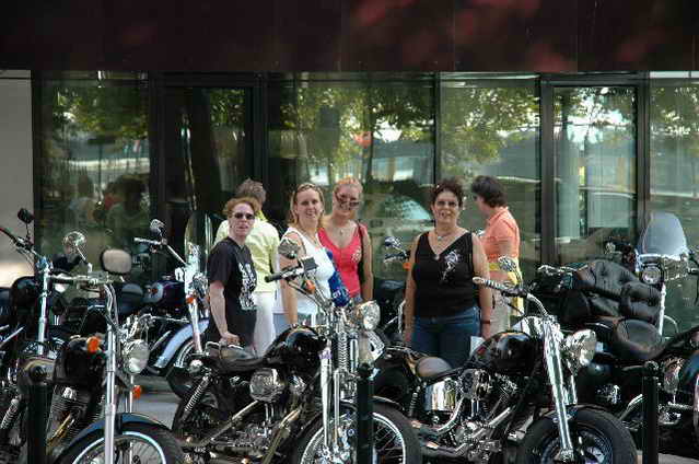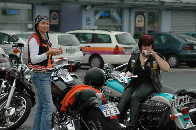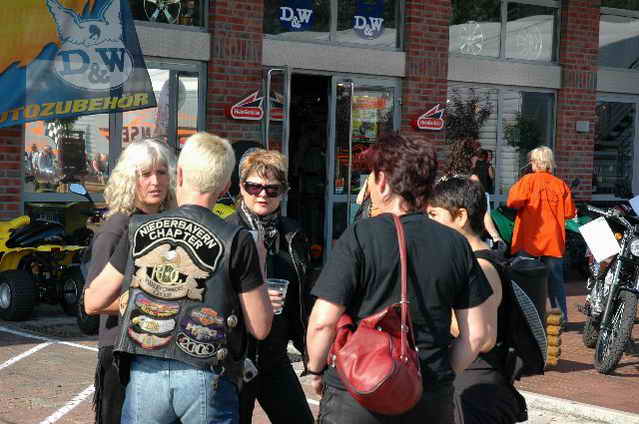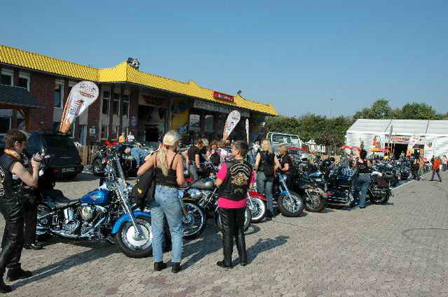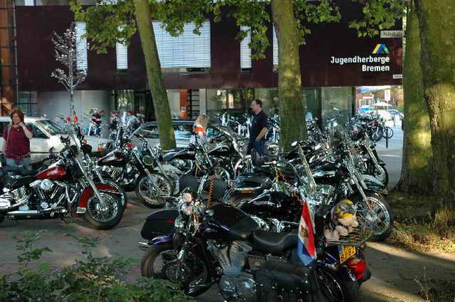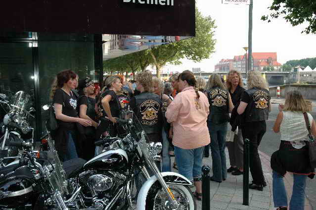 Habs fast vergessen, wir bekamen durch 5 adrette „Mädels“ vom „MC Mopped Stuttgart“ schwäbische Verstärkung. Wirklich sexy Girls, hatten nur etwas stramme und haarige Waden. Unter Polizeischutz ging’s dann zum Harley-Dealer, wo wir mit Cilli con Carne, Kaffee und Kuchen verwöhnt wurden. Die Eine oder Andere hat sich auch noch gleich neu eingekleidet, die Auswahl war riesengroß. Aufstellen zum Gruppenfoto. Der Rest des Tages war zur freien Verfügung, Helga und Dieter zeigten uns die Bremer Altstadt (Helga zeigte uns auch, in welchem Haus sie wohnte, als sie ihren Dieter kennen gelernt hatte).