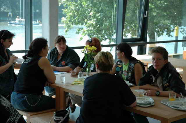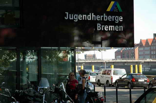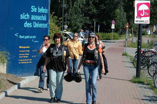 Auf der Kneipenmeile fast kein Durchkommen. Dann „Hallo“ und schon saßen wir bei den Kölnern Hanna und Eva. Annette von SKS war noch dabei und und und, man kann sich einfach nicht alle Namen merken. Nach einigen Beck’s, Radlern, Caipis, Wasser, Cola ging der erste Abend ruck zuck vorbei. Am Freitag fuhren wir nach dem Frühstück gemeinsam mit den Bikes zum Hansa-Container , wo uns Marys Arbeitgeber sehr herzlich empfangen hat. Danach gings gleich weiter in verschiedenen Gruppen zum Universum und anschließend nach Bremerhaven zum Fisch essen.