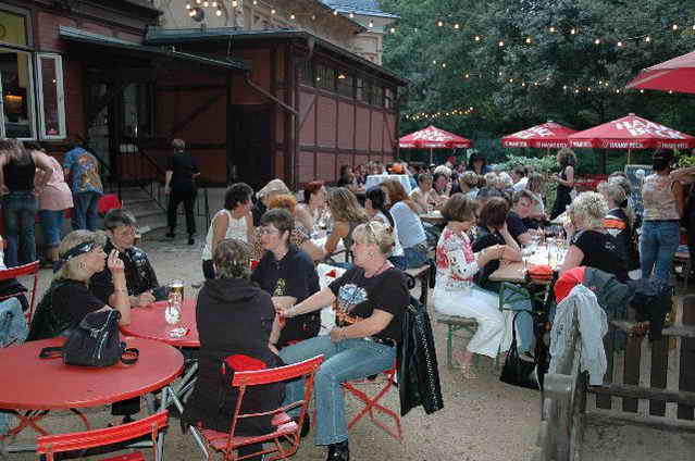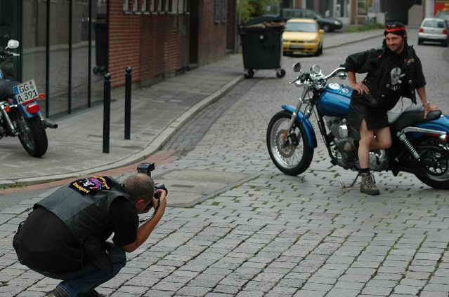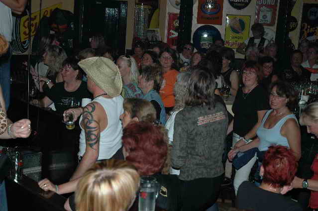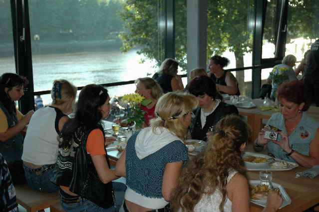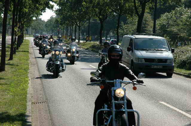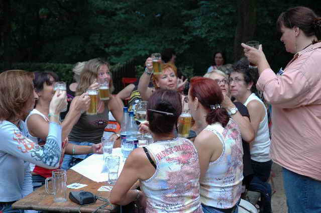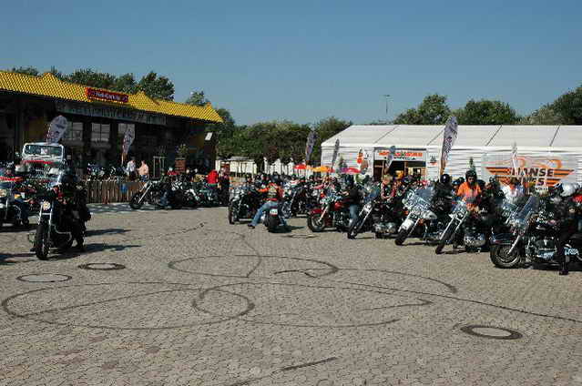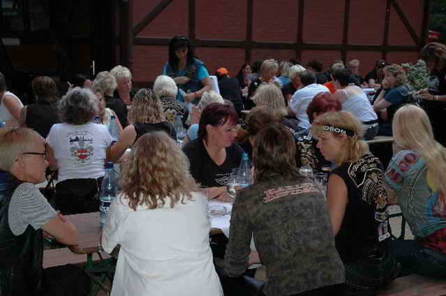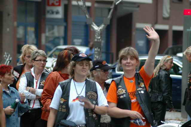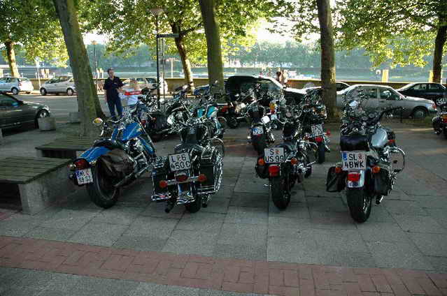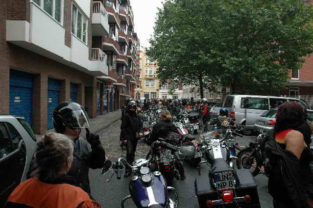 Wieder aufsitzen und zurück, denn um 18.oo Uhr fährt die Straßenbahn mit 1 x umsteigen, was für uns schon fast zum Problem wurde, - zur Party in die Waldschänke. Super Biergarten, super Stimmung und die Durchsage, dass sämtliche Getränke, außer Schnaps, bis 24 Uhr frei seien, was natürlich die Stimmung weiter anheizte. 30 Min. später die ersten Regentropfen. Alles rein ins Lokal, wo die Rock’n Roll-Band sich tierisch freute, dass nun alle drinnen nen Platz suchten. Dann ging’s los, tanzen bis zum Abwinken, denn die Band spielte fast ohne Unterbrechung bis zum Umfallen, gegen Schluss mussten sie sich noch die Hosen festhalten, so waren die Mädels drauf. Denke, die könnten sich mit den Monroes locker anlegen. Ach ja, hätt ich fast vergessen, Helga und Dieter waren privat an diesem WoEnde ebenfalls in Bremen, sind wegen uns extra mit dem Moped gefahren und haben Rulaman mit ihrer Anwesenheit unterstützt. Dieter durfte natürlich nur unter unserem Schutz das Lokal betreten, ansonsten hielt er sich draußen unter einem Sonnen- bzw. an diesem Abend als Regenschirm umfunktioniert, auf. Aber so ist das halt bei einem LOH-Treffen. Gell Dieter! Die letzte Bahn fuhr dann um 01.17 Uhr zurück, wieder mit umsteigen. Am Samstag war dann Brauerei Beck’s im Schnelldurchgang angesagt und um 12.oo Uhr Aufstellung zur Parade.