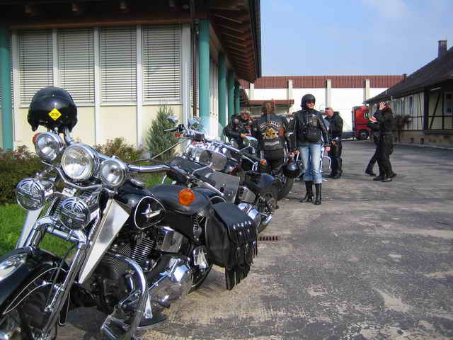 Augen auf und raus aus dem Bett! Morgens kurz nach acht klingelt der Wecker. Kaum hat man den ersten Zeh unter der Decke hervorgestreckt, da schaltet bereits der ganze Fuß auf der A 8 in den 5. Gang. Mit angefrorenen Fingerspitzen an der Kupplung und steifem Bein trifft man sich zehn Uhr Ausfahrt Heimsheim/ Mönsheim. Nach einem kurzen Klagelied über das Wetter dann weiter mit dreizehn Harleys inkl. einigen Harleyladies über Iptingen, Serres, Grossglattbach. Immer noch fröstelnd Richtung Roßwag: Was für ein schöner Bikertag !