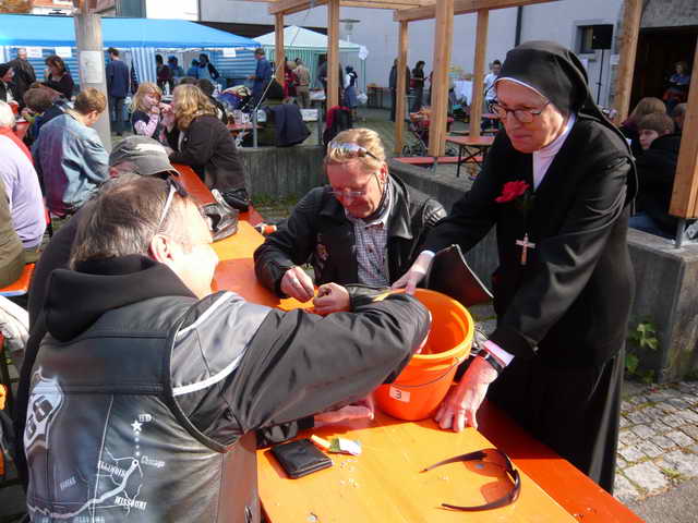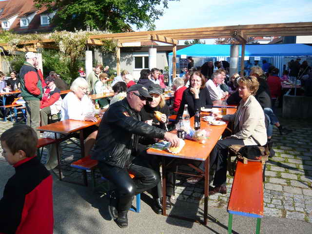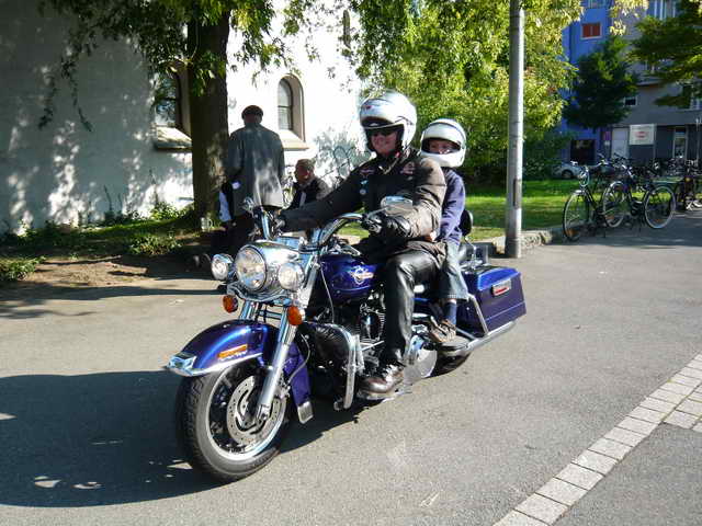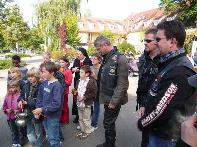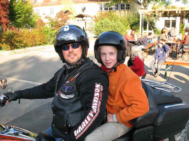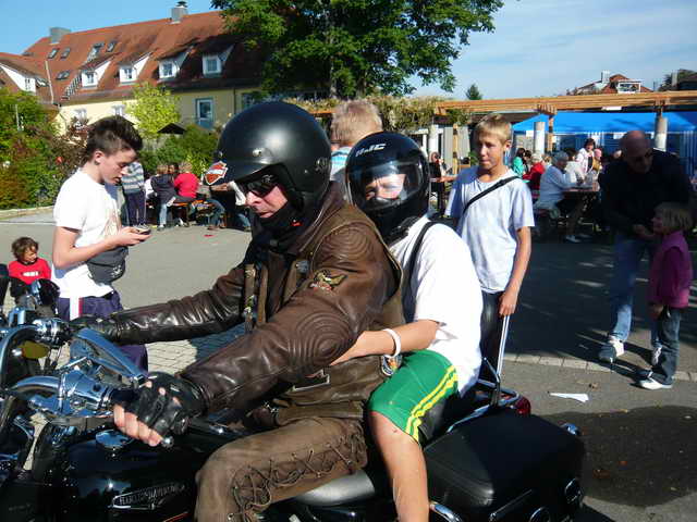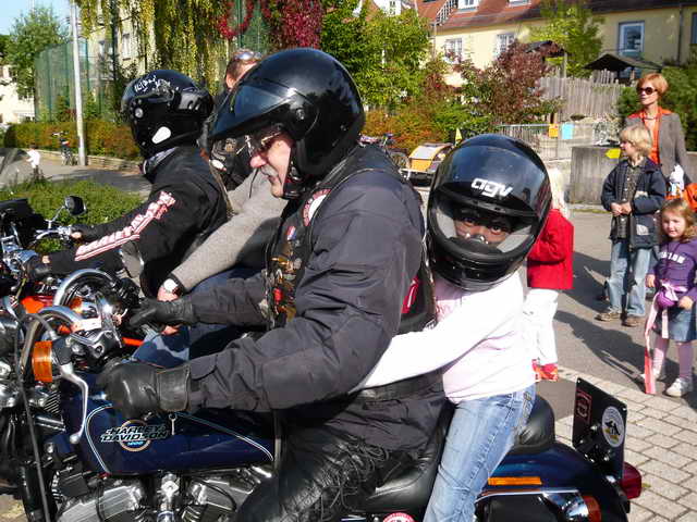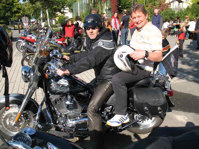 Groß war die Freude bei Jung und Alt. Viele kauften sich erneut ein Ticket, um möglichst auf jeder Harley einmal mitzufahren. Erinnerungsfotos in Form einer Postkarte brachten ebenfalls Geldspenden in die Kasse. Um 17.30 Uhr zogen dann Uwe und Paul zum ersten Mal intensiv an ihren redlich verdienten Zigaretten. Sichtlich lange inhalierten sie den Rauch ihrer Kippen und blickten zufrieden in die Runde. Alles lief reibungslos und unfallfrei. Die Essensstände boten kaum noch Auswahl, ein Zeichen, dass es allen gemundet und gefallen hat.