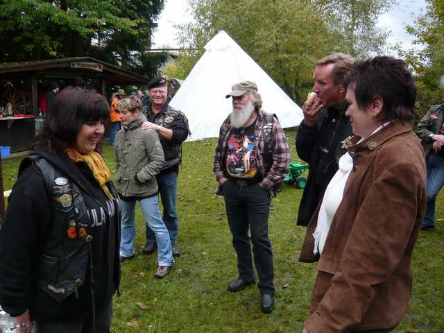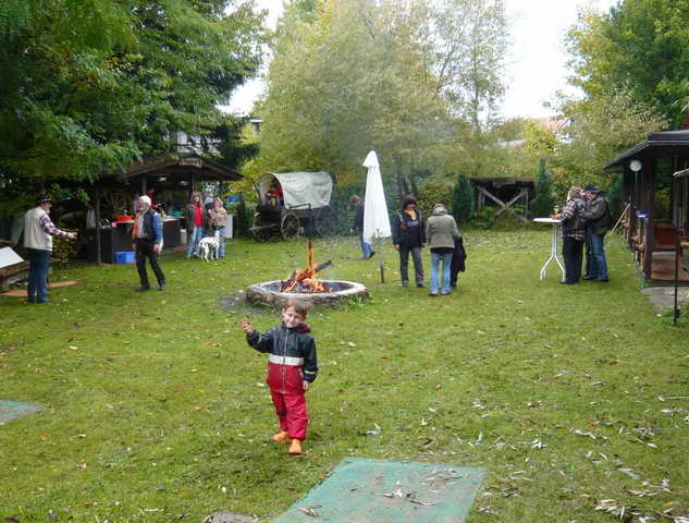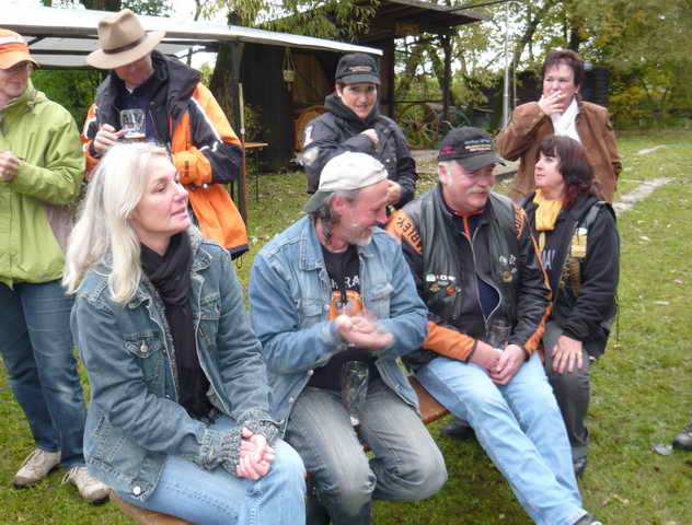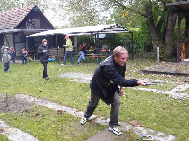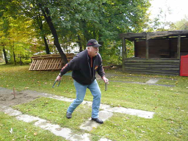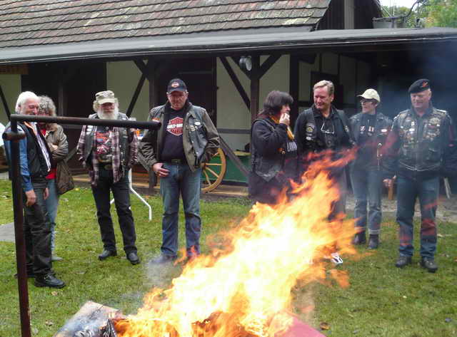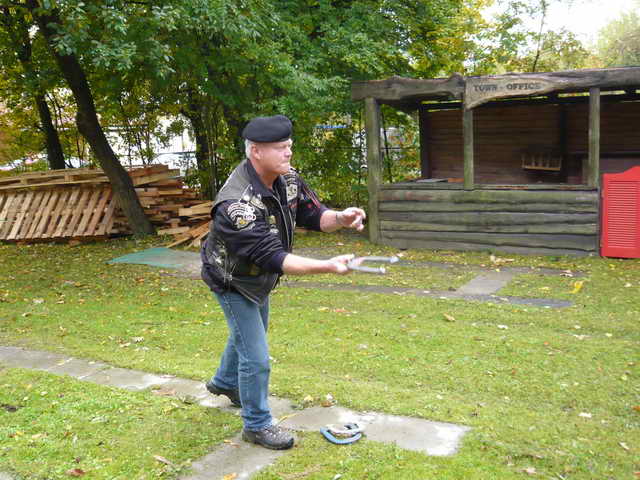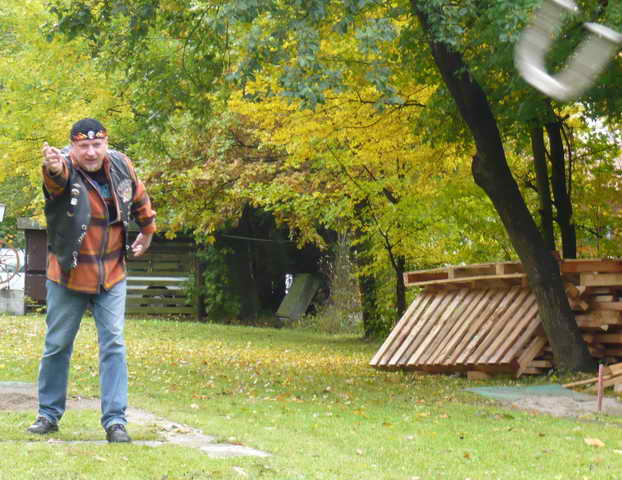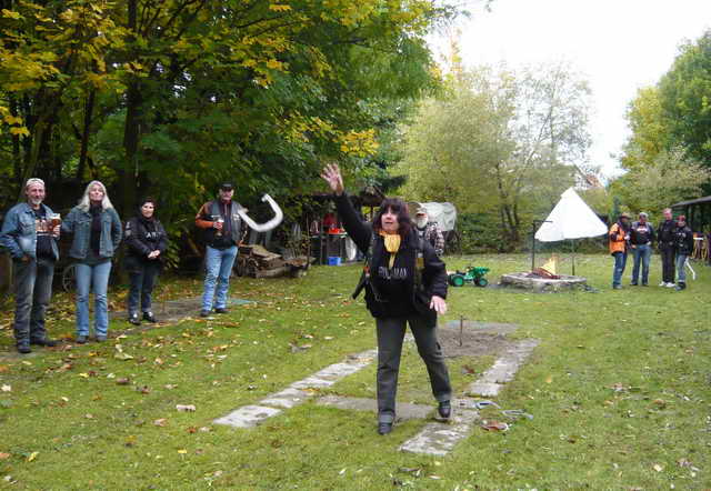 Also, wie immer am 3. Oktober trafen sich die Rulas zum alljährlichen Hufeisenweitwurf, so auch dieses Jahr. Das Wetter war so, dass ich beim Aufhängen der Vereinsfahne klatschnass geworden bin, aber 5 Minuten danach klärte es sich auf, das Lagerfeuer gab dank des verbrannten Mobiliars ordentlich warm und die Leute vom Country Club hatten außer Kaffee auch gleich einen Pott Glühwein bereit gestellt. Was nicht nur die gefühlte Temperatur, sondern auch die Stimmung anhob.