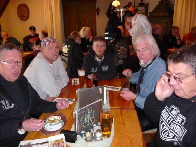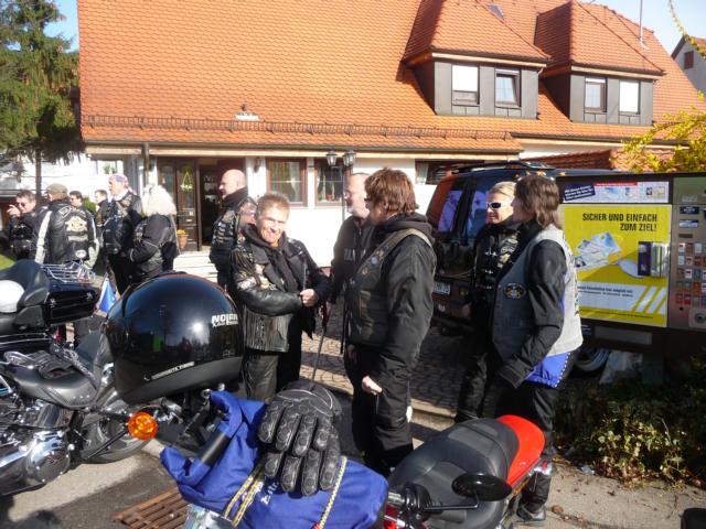 Von Reutlingen über Goaggenhausen nach Herrenberg, weiter Richtung Calw, Gechingen und Ostelsheim durchfahrend, machten wir in Weil der Stadt unsere erste Zigarettenpause. Bis hierhin konnte man doch den ein oder anderen Kollegen beobachten, wie er versuchte seine (eis-)kalten Finger an den Kühlrippen seines V-Twins zu erwärmen. Etwas Schwund gehört zu jeder Tour, diesmal erwischte es beinahe einen der Photographer. Nur durch de Aufmerksamkeit einiger Member bemerkte der Rest der Meute, welche schon abfahrbereit aufsaßen, dass der Photographer gemütlich schlendernd von der Pinkelbox kam. Als auch der Letzte abfahrbereit war, wurde dies durch vieltöniges Hupen kundgetan.