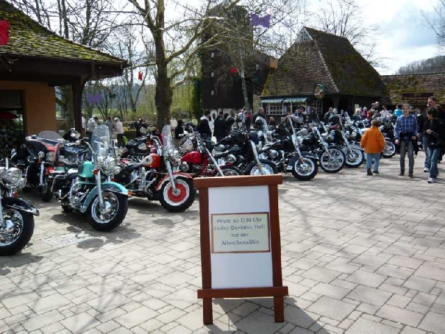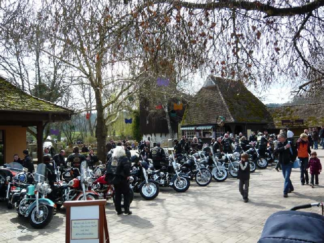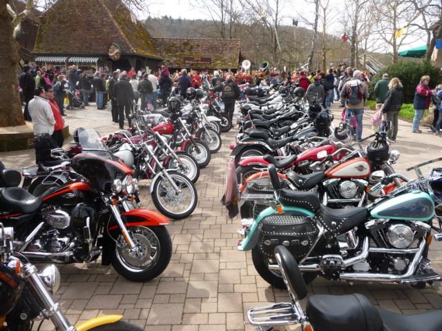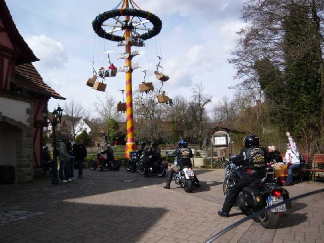 Weiter ging es über Heimsheim, Perouse, Weissach, Eberdingen nach Enzweihingen. Den Landstraßen dieses strukturschwachen Gebietes merkte Mann/Frau den erst gerade gegangenen Winter deutlich an. Über Oberriexingen, Sachsenheim und Freudental ging es zum Tagesziel: Erlebnispark Tripsdrill. Unser Roadcaptain hatten hier für uns noch ein Schmankerl organisiert: Die Bikes wurden im Park, vor den Augen der staunenden Besucher, in Reih und Glied an der Altweibermühle abgestellt.