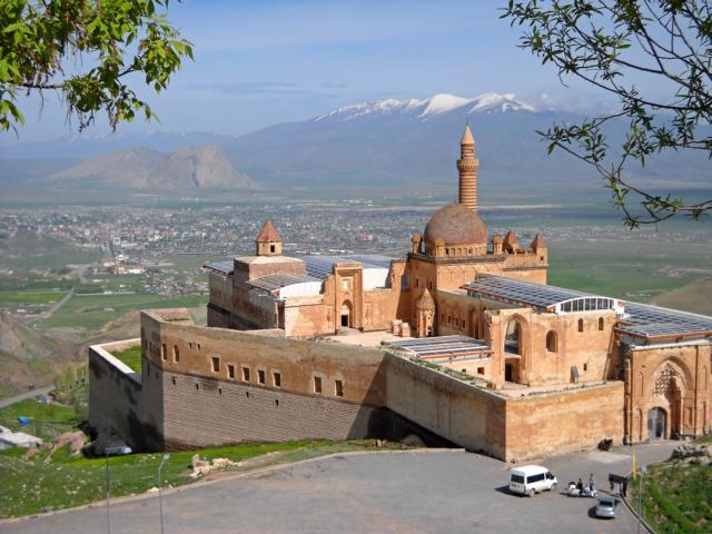 Die Tour geht weiter am Van-See entlang, mit Blick auf über 4.000 m hohe schneebedeckte Berge. Danach kommen wir in ein Gebirge, voller Lavagestein, das Werk des Vulkans Tendürek Dagi. Auf dem Tendürek Pass, 2.640 m, liegt Schnee und es ist kalt. Vorbei an sehr einfachen und armen Behausungen, mehrfach kontrolliert vom Militär (sehr freundlich) kommen wir nach Dogubayazit, 1.950 m hoch. Die kleine Stadt im äußersten Osten der Türkei, nahe der Grenze zum Iran, ist Ausgangspunkt für die Besteigung des Vulkans Ararat, 5.137 m, in der Nähe zu Armenien, Aserbaidschan und Iran. Der Ishak-Pascha-Palast auf 2.200 m Höhe zählte früher 366 Zimmer. Er kann besichtigt werden und man hat von dort einen herrlichen Überblick in die Landschaft.