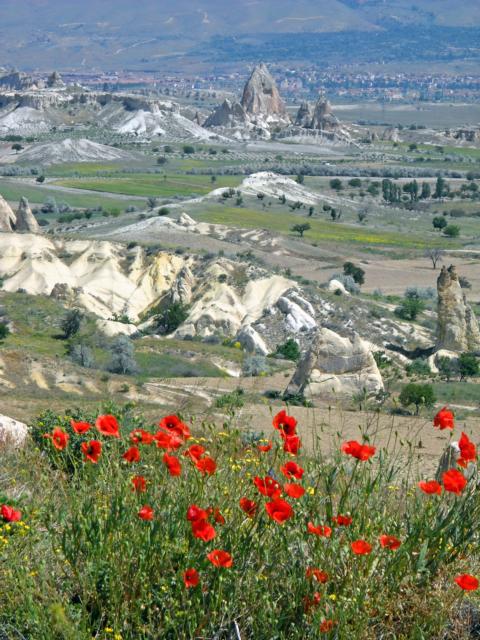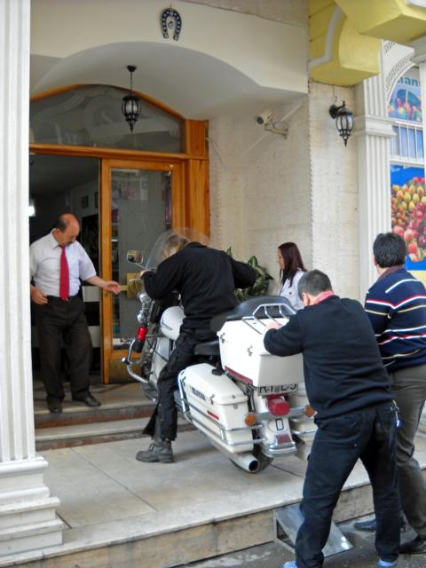 Wir kommen nach Uchisar, einer der schönsten Orte in Kappadokien, wo der Burgfelsen wie ein Emmentaler Käse durchlöchert ist. Kappadokien, an der berühmten Seidenstraße gelegen, ist eine versteinerte Märchenlandschaft, Weltkulturerbe und Weltnaturerbe, für die wir uns 2 Tage Zeit nehmen. Von Kappadokien aus fahren wir ins westanatolische Binnenland, Richtung Konya. Wir besichtigen Sultanhani, inmitten einer öden Hochebene. Es ist die größte und besterhaltenste Karawanserei in Kleinasien, 1229 erbaut. Von dort erinnert uns die Weiterfahrt an Wyoming, USA: endlose Straße, menschenleer. Durch große Schlafmohnplantagen – staatlich kontrolliert – erreichen wir Afyon, wo ich auf abenteuerliche Weise, über mehrere Stufen, mit dem Motorrad in die Lobby fahren muss.
