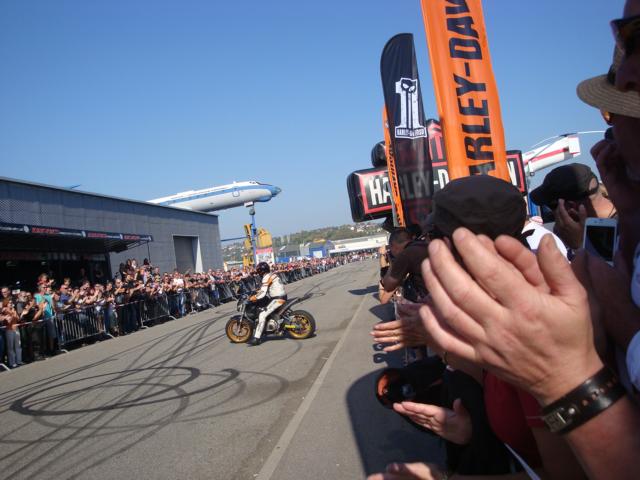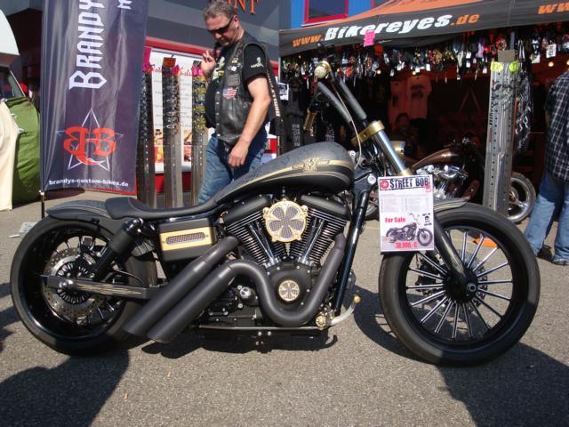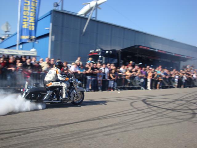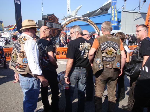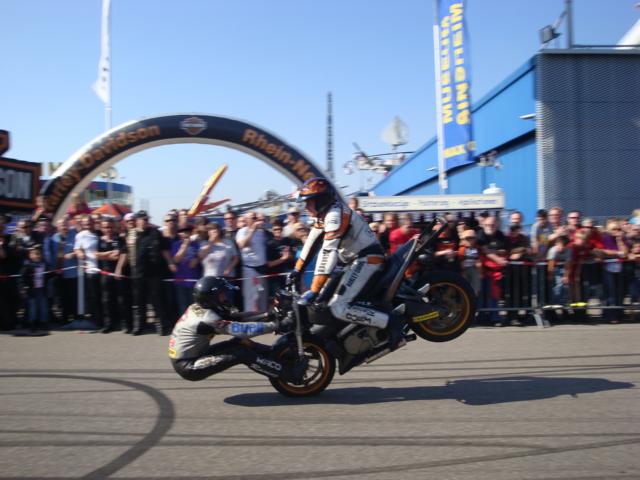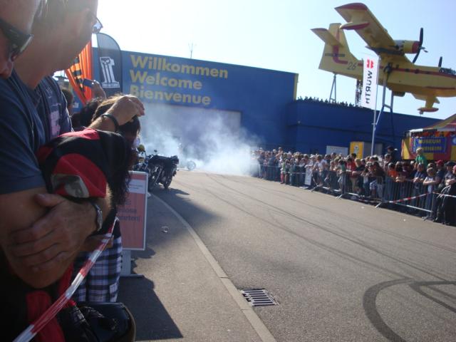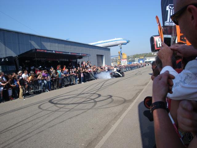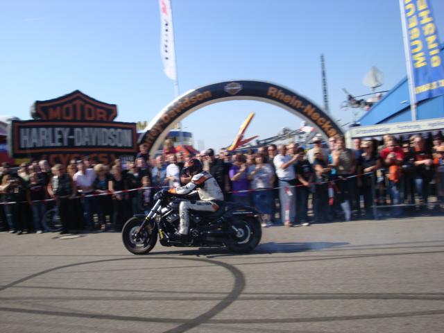 Gemütlich schlenderten wir an den vielen Ständen vorbei und ließen uns von den tollen Bikes inspirieren, was man über den Winter noch um- und anbauen könnte. Auf dem Festgelände trafen wir noch unseren Vice, der gerade vom Direktorentreffen in Fulda zurückkam.Ein Highlight war die Rainer Schwarz Stuntshow. Der Mann hat seine Bikes wirklich im Griff. Ich habe die Show jetzt schon mehrmals gesehen und bin immer noch begeistert. Für mich heist es üben und nochmals üben, damit ich das in der nächsten Saison so oder ähnlich hinbekomme (ok - war ein Spass). Danach wurde das grösste Motorrad der Welt von der Harzer Bike Schmiede vorgestellt. Das Ding fährt tatsächlich - mit einem Panzermotor. Die Show, bis sich dieses Ungetüm bewegte war nett anzusehen. Eines ist sicher: vom Harz sind die Jungs bestimmt nicht mit diesem Motorrad nach Sinsheim gefahren.