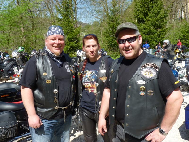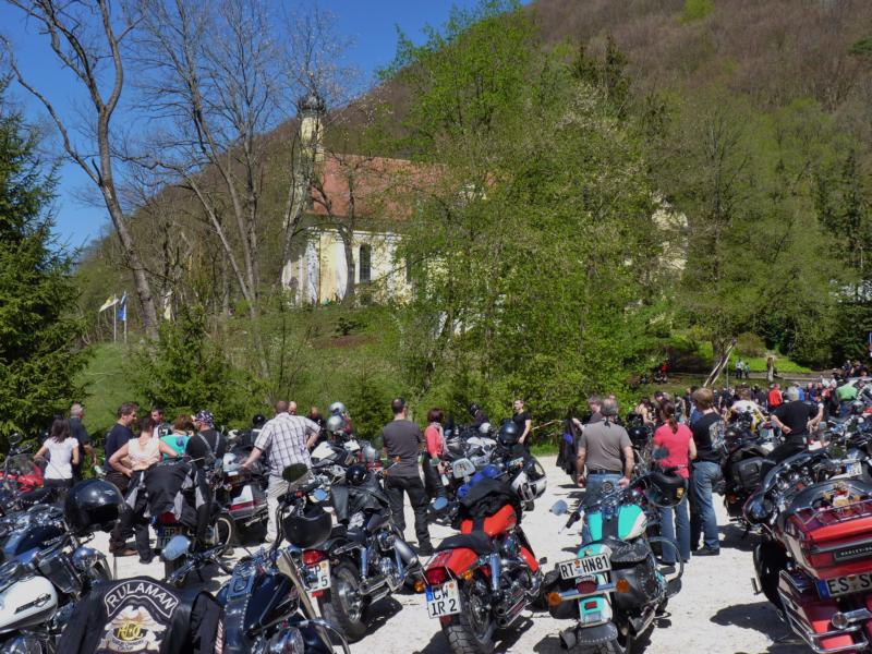 Der große Parkplatz unterhalb der Kirche war schon gut gefüllt, als wir ankamen. Nach einer halben Stunden startete die Ausfahrt. Gudrun zählte ca. 400 Motorräder, die bei der Ausfahrt mitfuhren. Wir fuhren auf kleinen Nebenstraßen der schwäbischen Alb rund um Deggingen. Dass die Bikesegung schon Tradition hatte merkte man unter andrem daran, dass sich Groß und Klein am Straßenrand versammelte und den beifahrenden Motorradfahrern zuwinkte.