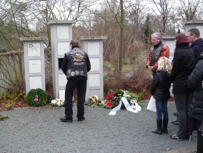 Da standen wir, 44 hartgesottene Biker, mitten im Motorenlärm, den wir so lieben und die Tränen liefen bei Allen. Erst als alle den Finger von der Hupe genommen hatten bewegte sich der kleine Trauerzug wieder und die Motoren wurden abgestellt. Wir folgten der Familie zur Urnenbeisetzung. Als ich zusammen mit dem Vice vor dem offenen Urnenplatz in der Mauer stand, sah ich, dass außer der Urne auch die RULAMAN Gürtelschnalle, seine Brille, ein Satz Motorradschlüssel von der Familie dem Urnengrab beigelegt worden war. Unser Vice legte noch zur Erinnerung einen RULAMAN-15 Jahres Pin mit dazu.