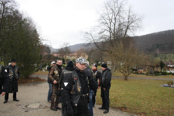 Bald stellte sich heraus, dass die zwei sehr wohl unsere Trauernachricht gelesen hatten, aber aus anderen Beweggründen, als der Beisetzung beizuwohnen, gekommen waren. Die beiden Herren waren von der KRIPO Reutlingen und befürchteten Massenaufläufe, Bandenkriege, Verkehrschaos und was weiß ich noch was. He wir waren RULAMAN und waren dabei, einen unserer Member auf seinem letzten Weg zu begleiten.
