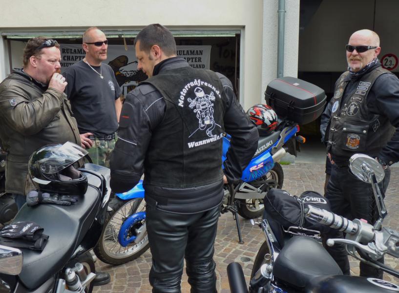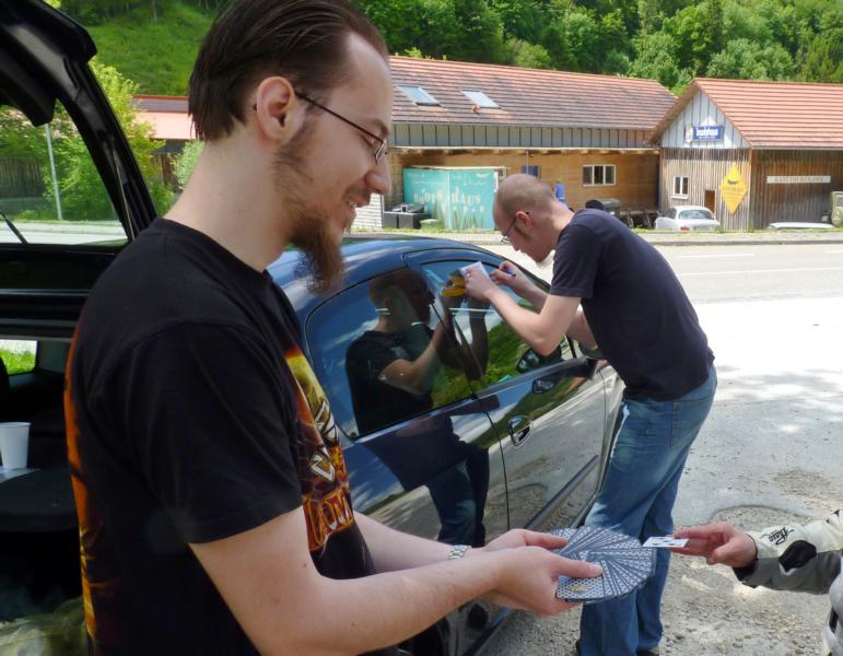 Um 9 hatte ich einen Termin mit den Reportern des Reutlinger General Anzeigers, die über RULAMAN und unseren POKERRUN berichten wollten. Gemeinsam fuhren wir zum Treffpunkt in das Clublokal Waldeck in Rübgarten. Schon einige RULAS waren vor Ort und natürlich Thomas und seine Helfer, die er auf das Thema eingeschworen hatte.