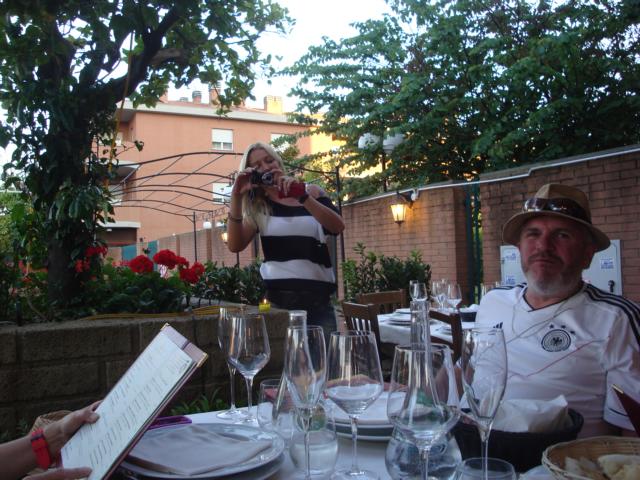 Die anderen Rulas mit den Mehls, Angie, Axel, Gerd und Thomas, ein Bekannter von Axel, trafen am Spätnachmittag in der Nähe von Ostia (ca. 25 km von Rom) ein, wo sich das Eventgelände befand. Nach einigem telefonischen Hin- und Her fand ich die Gruppe und wir nahmen ein gemeinsames Abendessen ein. Leider hatten sie nicht so viel Glück mit dem Wetter und mussten bei strömenden Regen fahren. Aufgrund des schlechten Wetters und Öl auf der Straße ereigneten sich 2 kleine Unfälle, wobei Gerd aufgrund des Unfalls unterwegs noch an der Hand genäht werden musste.