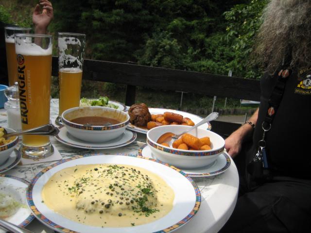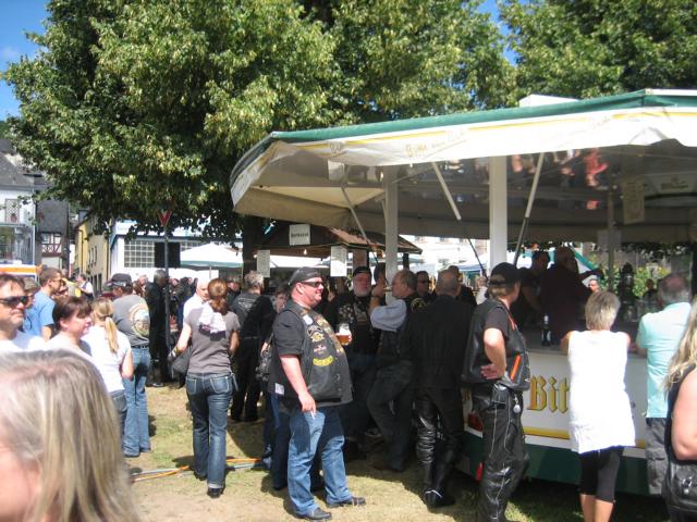 Bei der Ankunft in Ürzig wurde kurz der Festplatz mit den verschiedenen Weinständen bzw. Bier-, Currywurst-, Los-, Schieß-, Mandeln- und Reibekuchenbuden, Stände verschiedener kleinerer Ausrüster, sowie dem Harley Händler aus Konz in Augenschein genommen. Das der „Schaltstangen Alfons“ ebenfalls mit seinem Stand vor Ort war, bedarf eigentlich keiner weiteren Erwähnung, da er zum festen Bestandteil fast aller kleineren und auch größeren HD Veranstaltung (z.B. MBR, HH Harley Days bzw. Faak) zählt. Nach der Eintragung in die Teilnehmerliste und dem Erwerb der Veranstaltungsjubiläumspins sei dem „unerfahrenen erstmaligen Teilnehmer“ dieser Veranstaltung höchst vorsorglich angeraten, vor der Einnahme des Zimmers erst ein Speiserestaurant aufzusuchen, um hier eine belastbare Grundlage, durch eine stabile Nahrungsaufnahme, für den weiteren Verlauf des Tages zu schaffen. Bei uns ist dies immer, die oberhalb in den Weinbergen liegende Ürziger Waldschenke, mit ihren hervorragenden Rinderrouladen.