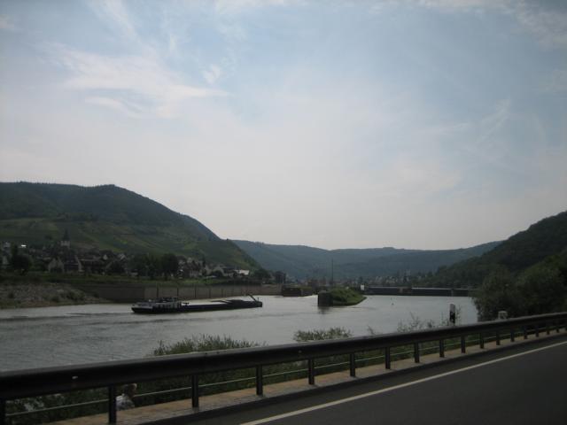 Viele kennen die Saarschleife, aber die wenigsten wissen, dass die Mosel auf dem Weg zum Rhein in dem nun zu befahrenden Teil nach Ürzig zwei komplette Schleifen aufweist. Die eine befindet sich im Bereich Bullay, Zell (hier heißt eine der bekannten Weinlagen Zeller schwarze Katz´) und Plünderich; die zweite liegt im Bereich Burg, Traben-Trarbach und Kröv. (bekannte Weinlage Kröver Nacktarsch, die heißt tatsächlich so!) Die Mosel selber führt zu Zeit eine hohe Wassermenge, so das über die beweglichen Staumauern der einzelnen Schleusen, als auch durch die Kraftwerke, wie den Bildern entnommen werden kann, große Wassermenge Richtung Rhein abgeleitet werden.