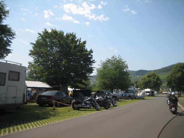 In Ürzig angelangt, fällt als erstes der sehr stark frequentierte Mosel Campingplatz auf. Wohnmobile in allen Größen mit Excalibure bzw. sonstigen Anhängern, Campingwagen, Zeltareas und eine hohe Anzahl von Harley Davidson Motorrädern wertete die Uferzone positiv auf. Da alle Unterkünfte in Ürzig komplett belegt und auch die Ausweichquartiere in den Nachbarorten nicht unbedingt von Vorteil sind (Shuttlebus, Taxi, Fußmärsche etc.), die Teilnehmerzahlen aber seit Jahren stetig steigen, bleibt den „Nachrücker“ gar keine andere Alternative mehr um direkt vor Ort sein zu können.
