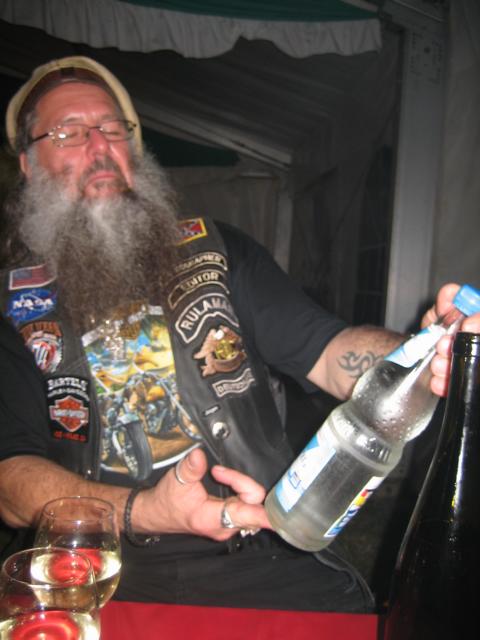 In diesem Jahr waren wieder verschiedene freie Händler mit vielen Accessoires für Maschine und Lenker(in), der „Schaltstangen“ Alfons, der HD Händler aus Trier-Konz und erstmalig die German HOG Charity mit unserem Chief Heinz, vor Ort und rundeten den Event Zeltbereich mit Schieß-, Flammkuchen-, Mandeln-, Currywurstbuden, Wein- und Bierstände (?) ab. Um 18.30 Uhr beginnt die offene Weinprobe mit der Verkostung von 100 Sorten Riesling Weine der Region Ürziger Würzgarten und verlangt den Teilnehmern schon ein gewisses „Standvermögen“ ab. Die musikalische Unterhaltung wurde am Freitag von der Band „Handpicked“ bestritten, deren Programm als sehr gut zu bezeichnen war. Zwischen durch trat als Special Guest Michael Müller, laut Programm ein Biker Kabarettist auf, aber selbst nach mehrmaligem Nachfragen am Samstagmorgen beim Frühstück konnte sich definitiv keiner an das Repertoire erinnern, da die Pointen irgendwie im Lärm des komplett gefüllten Festzeltes „untergingen“.