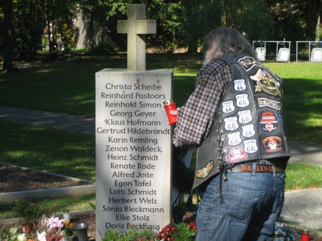 Bereits in Faak hatte man uns beide auf das geplante erste Oktoberfest, im Areal des Clubhauses der 45 Bad Friends in Hagen-Hohenlimburg, welche wir alle aus der Zeit des „alten“ Thousend Hills Chapter kennen, angesprochen, bzw. uns diesbezüglich eingeladen. Eine Einladung, welcher wir gerne Folge geleistet haben, da wir gleichzeitig noch einen Halt auf dem ev. Friedhof in Meinerzhagen einlegen konnten und unserem im Jahre 2014 verstorbenen alten Fahrensfreund, Polizeihauptwachtmeister Reinhard Pastoors, besser bekannt als ZZ, langjährige Vice des Thousend Hill Chapter, bzw. Vice der 45 Bad Friends, Mitglied der Chapter Band Rocking Old Stars, die Ehre zu erweisen. Für die Leser, welche zu Zeit nicht mehr wissen, wer ZZ war, haben wir ein Bild aus alten Tagen diesem Bericht ebenfalls anbei gefügt.