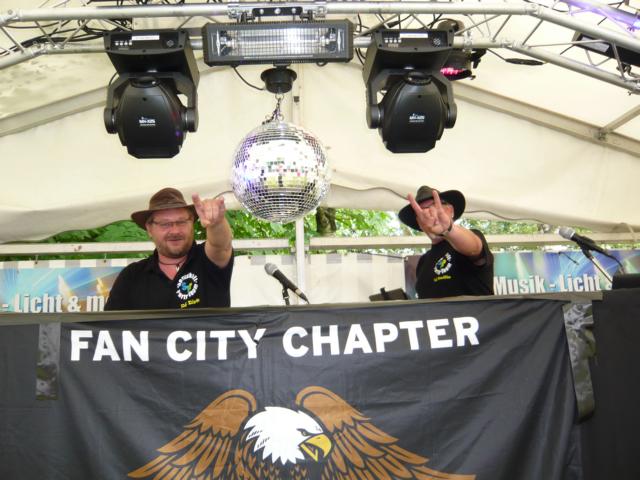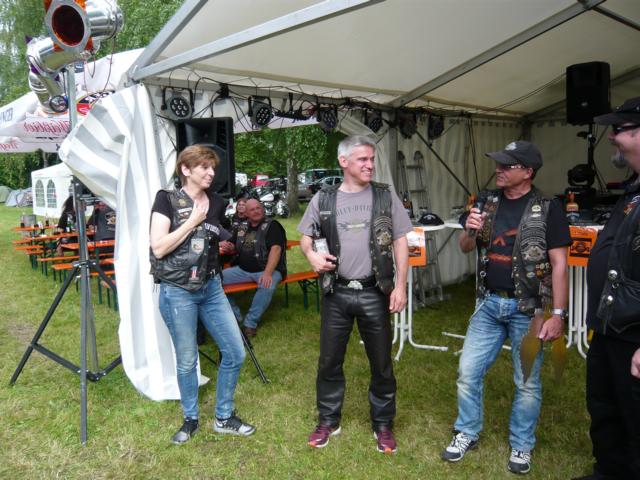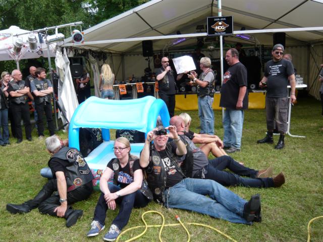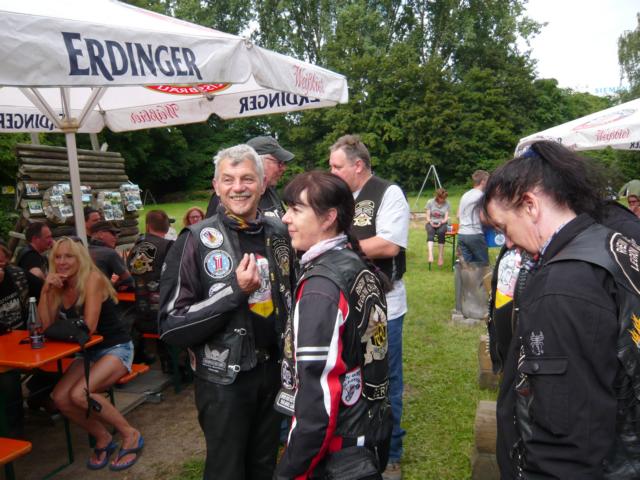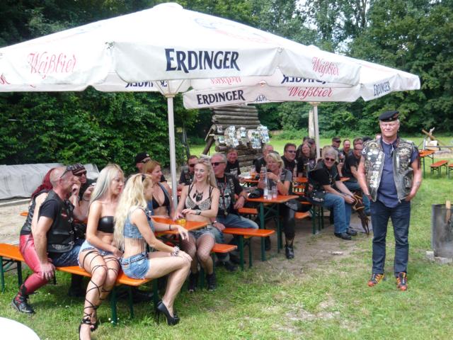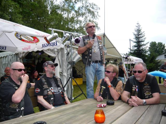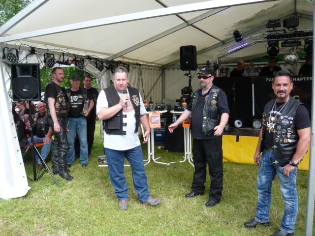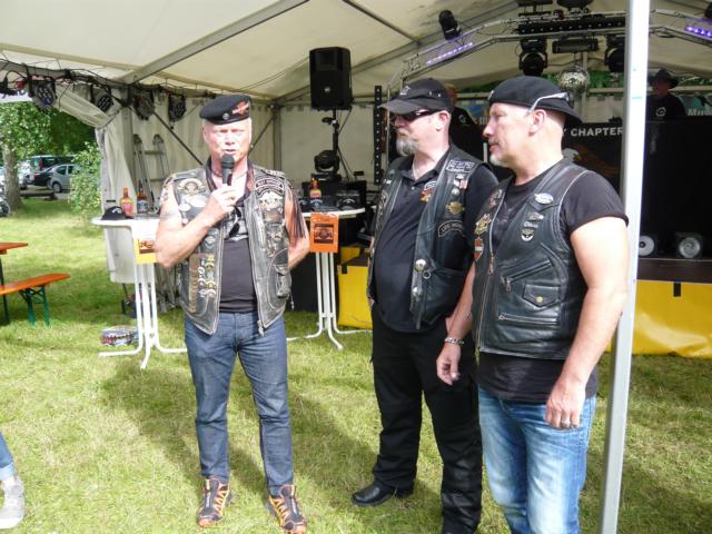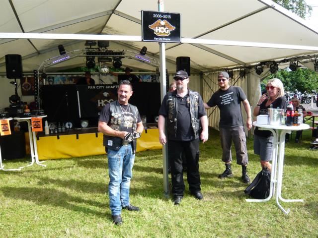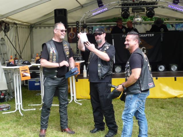 Mit Unterstützung der RC`s des FCC ging es mit ca. 30 Bikes zum Eventgelände. Das Wetter passte, die Freunde warteten bereits und nach einer kurzen Eröffnungsrede fing die Party mit Biker-Spielen und viel Spaß an. Durch das Programm führte unser alter Freund Reinhard vom FCC. Nach Übergabe unseres Geschenks an Ralf, Director des FCC bekam ich zur Antwort, dass das Geschenk einen Ehrenplatz einnehmen werde. Nach und nach trafen die befreundeten Chapter des Rhein-Valley, Rhein-Mosel und die Schwaben auf dem Gelände ein.