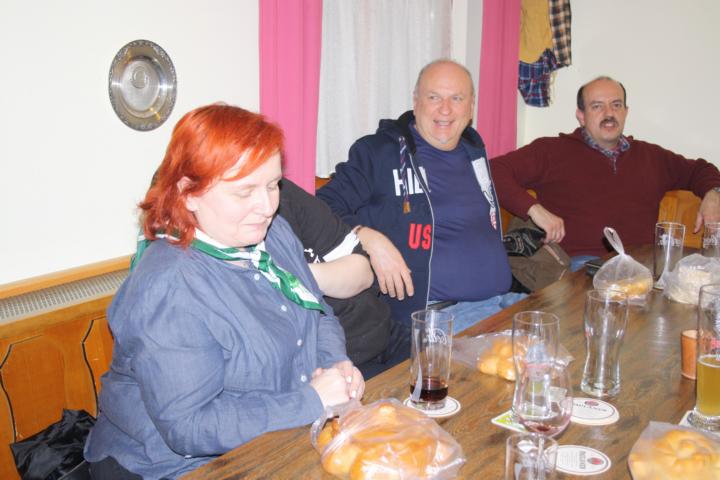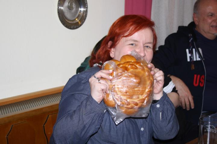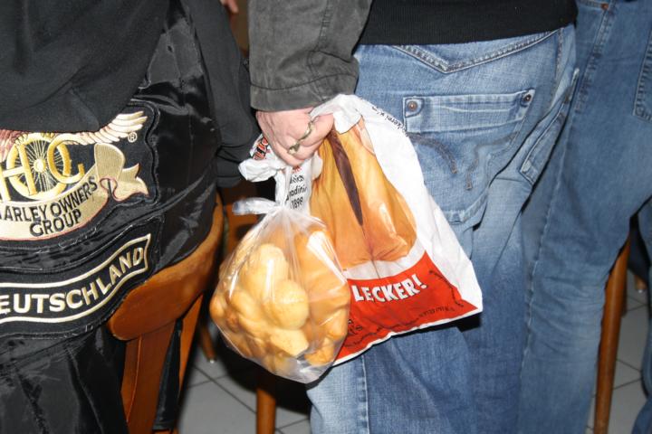 Nach und nach trudelten die Member in der Fischerkischd, unserem Vereinsheim, ein. Die Fischerkischd war so voll, dass wir uns an den einzigen freien Tisch drängen mussten. Dann kamen Heinz und Gudrun mit der Nachricht, dass die frühzeitige Bestellung der Mutscheln bei der Bäckerei für den falschen Tag terminiert war. Kurzerhand wurden alle verfügbaren Mutscheln aufgekauft und weitere Member aktiviert, dies ebenfalls bei den Bäckereien zu machen, bei denen sie vorbeifuhren.