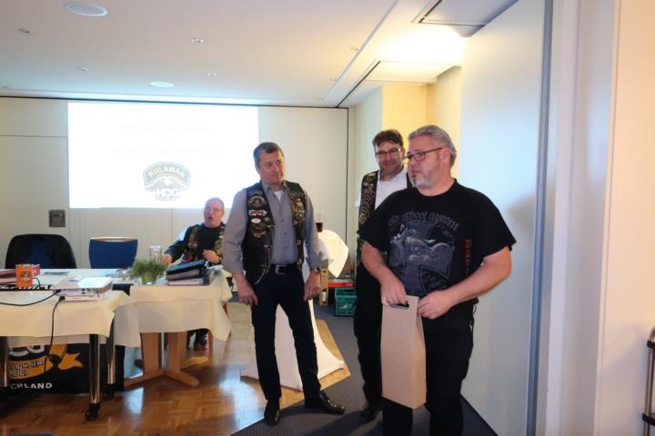 Des Weiteren wurde als Dank und Anerkennung ihrer langjährigen Tätigkeit als “unsere ehemalige Frau L.O.H.“, Gudrun Nestel, vom Director Dieter ein Blumen Ensemble überreicht, bevor dieser unserem ehemaligen, langjährigen Secretary Roland Weber I, sowie dem ehemaligen Road Captain Joel Loiseau als Dank des Chapters ein Weinpräsent aushändigte.