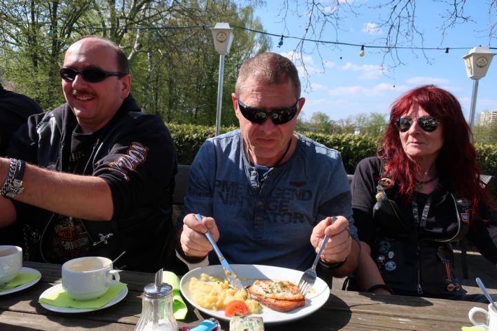 Aufgrund des straffen Terminplans verweilten wir nur kurz. Leider starte bei der Rückfahrt die Maschine von Gerd aufgrund technischer Probleme nicht mehr. Holger hatte die rettende Idee, die Maschine 100 Meter vom Ausflugslokal wegzuschieben. Die Funkfrequenzen der elektronischen Handscanner der Bedienungen und die der Harley vertrugen sich nämlich nicht.