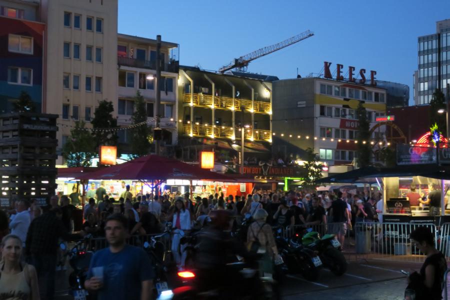 Freitags war ein relativ ungestörtes, wenn auch stockendes schlendern über den gesamten Bereich bei bester musikalischer Unterhaltung von den beiden Bühnen möglich, was sich zum Feierabend hin durch weitere Besucher immer mehr verdichtete, sodass wir wieder in „unser Stammlokal Schmidt Tivoli“ auf der Reeperbahn uns mit anderen HD Freunden abgesetzt haben. Freitags ist hier stets Karaoke, wie immer im Leben der eine kann es, der andere weniger; aber das Lokal ist draußen und drinnen „rappelvoll“ und eine tolle Stimmung unter allen Besuchern, egal ob HD Fahrer oder sonstige. Auf der Reeperbahn haben sich auch einige Änderungen ergeben, Olivias Kiezkneipe im Bereich Herz von St. Pauli ist verschwunden, auf dem Spielbudenplatz ist ein “städtischer Biergarten mit wenig Begleitgrün“, aber einer Vielzahl von Getränkeständen und Schwenkgrill Buden zzgl. Live Musik entstanden, welcher offenbar über den gesamten Sommer/Herbst betrieben wird.