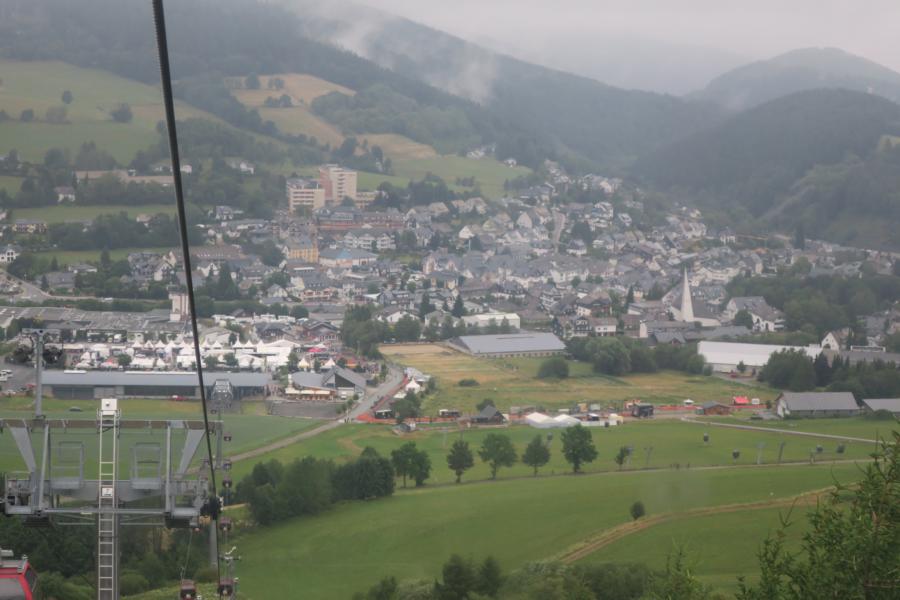 Kurzer Blick Richtung Eventgelände, kaum noch einer da, Zelt übervoll, also Taxi Richtung Willinger Brauhaus. Diese Idee hatten andere aber auch schon, komplett, wie verschiedene andere Gaststätten, Kneipen, welche aber teilweise wegen ihrer Musik schon im Vorfeld ausschieden, überfüllt waren. Als weitere Alternative stand dann noch für uns Leos Terrasse im Best Western Plus auf der Liste und richtig hier trafen sich die etwas „gesetzteren HD´ler“ zu Benzingesprächen, unter Hinzuziehung verschiedener Willinger Biersorten etc. und versuchten bzgl. des Wetters den nötigen Abstand zu gewinnen. Bevor es vergessen wird, richtig der Heimweg vollzog sich ebenfalls im Regen und am frühen Morgen gab es als Zugabe noch ein Gewitter. Samstags steht traditionell Siggis Skihütte auf dem Ettelsberg mit der gleichnamigen Seilbahn auf dem Programm; war auch eine gute Entscheidung, das Eventgelände glich einem Schlammfeld, auf das man versuchte mit Rindenmulch wieder einen begehbaren Bereich zu schaffen. Bei Siggi war es wie immer, alles voll, tolle Stimmung, draußen Nebel, natürlich Regen und die letzte Talfahrt der Seilbahn geht um 17.00 Uhr. Zu dem Zeitpunkt saßen wir aber mit unseren Freunden schon beim Essen in der empfehlenswerten Pizzeria Pie. Im Anschluss noch einmal kurz in das Hotel bzgl. trockener Bekleidung und wieder raus zum Event. Phasenweise gab es sogar einmal trockene Abschnitte, aber es kühlte ab bis auf 10 Grad, so dass man sich am späten Abend entschlossen, da wir bei der Verlosung auch nicht die entsprechenden Kombinationen hatten, die weiteren Aktivitäten in Leos Terrasse fortzusetzen.