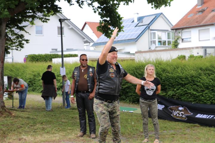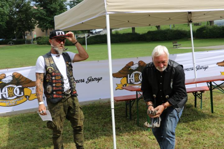 Nach der Rückkehr wartete Kaffee und Kuchen auf uns und dann ging es schon los mit den Bikerspielen. Es wurde ein Laufzettel ausgehändigt, auf dem nach jedem Spiel die Punktzahl eingetragen wurde. Damit auch unser Nachwuchs bei den Spielen teilnehmen konnte, gab es Dosenwerfen, Putten mit dem Golfball und Hufeisenwerfen und Bean Bag Toss. Eine eigene Wertung gab es für den Kurbelwellen-Weitwurf einer 8 kg schweren Kurbelwelle. Hier galt es die Technik des vor einem Werfenden zu studieren ob mit Anlauf, kreisförmiges Ausholen und Werfen … Des weiteren steuerte Horstmar Segways für einen gelungenen Nachmittag bei.
