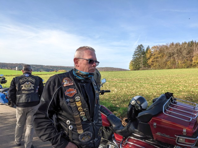 8 Bikes trafen sich an der Jet-Tankstelle in Ofterdingen. Nach einer kurzen Lagebesprechung ging es los. Auf der schwäbischen Alb machten wir auf einem Rastplatz einen Zwischenstopp. Von da aus ging es leider für Tom nicht mehr weiter. Der Gaszug seines 26 Jahre alten Bikes war gerissen und das Problem konnte mit Bordmitteln nicht behoben werden.