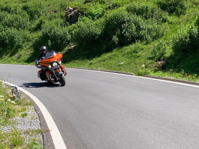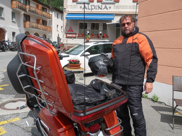 Weiter ging es nach Livigno, wo wir eine Mittagspause einlegten. Als es zu regnen anfing hatten wir Glück uns bei der örtlichen Tankstelle unterzustellen, bevor es so richtig herunterprasselte. Der Regen hörte zwar schnell wieder auf, dafür ging aber die Temperatur deutlich herunter. Auf dem Flüelapass waren es zeitweise nur noch 8 Grad.