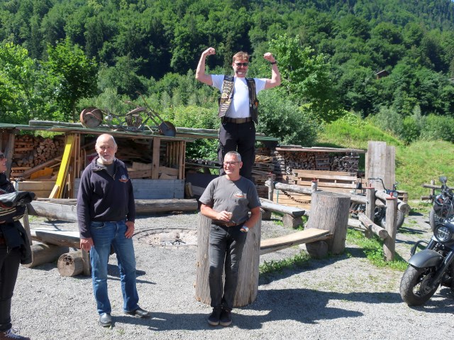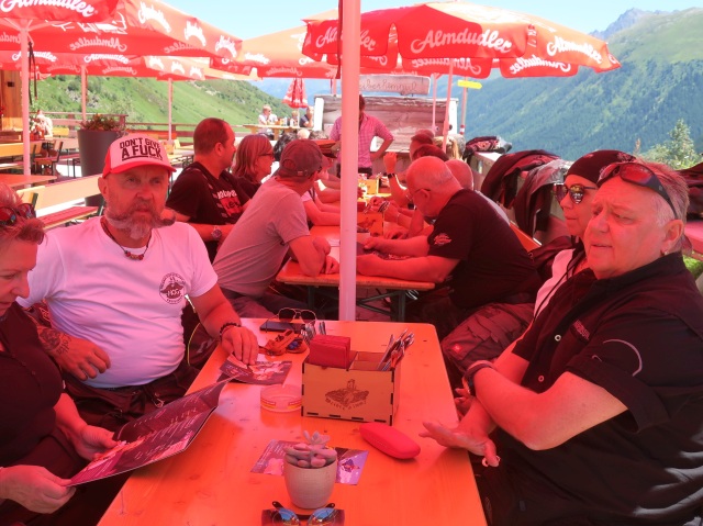 Am Samstag stand bei Bilderbuchwetter zuerst ein Besuch des Harley Clubs, Montafon an. Danach fuhren wir die Silveretta Hochalpenstraße bis zum See. Das blaugrüne Wasser des Sees wird von Bergen umrahmt bildet eine fantastische Kulisse. Nach dem obligatorischen Gruppenfoto fuhren wir zum Stausee Koops. Auf der Weiterfahrt streikte Horstmars Mopped. Ede wusste jedoch Rat und schnell war das Mopped wieder flott. Wir fuhren dann weiter zum „Weiberhimmel“, einem urigen Hotel und Restaurant, wo wir unser Mittagessen einnahmen.