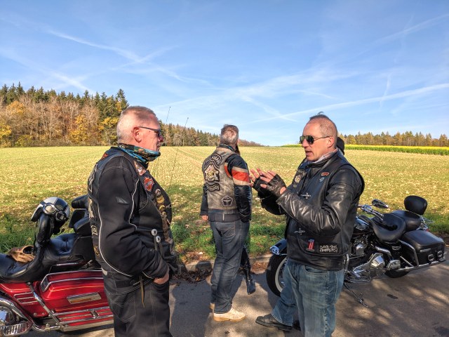 8 Bikes trafen sich an der Jet-Tankstelle in Ofterdingen. Nach einer kurzen Lagebesprechung ging es los. Auf der schwäbischen Alb machten wir auf einem Rastplatz einen Zwischenstopp. Von da aus ging es leider für Tom nicht mehr weiter. Der Gaszug seines 26 Jahre alten Bikes war gerissen und das Problem konnte mit Bordmitteln nicht behoben werden.