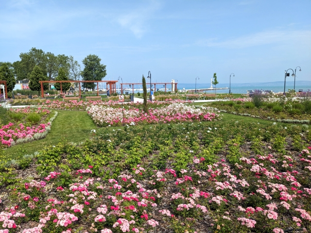 Wir hatten beschlossen, erst zum Balaton und dann nach Budapest weiterzufahren. Am Balaton übernachteten wir in Siofok und machten am Mittwoch eine Tour um den See. Im „Lavendeldorf“ Thiany machten wir Rast und bewunderten den Ausblick auf den See, bevor wir mit der Fähre ans andere Seeufer übersetzten. Abends ging es dann noch auf die mangels Besucher ziemlich ruhige Flaniermeile in Siofok.