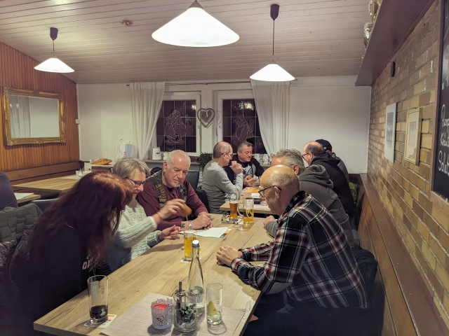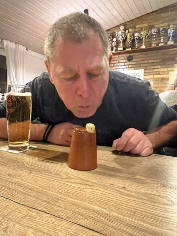 Leider nahmen dieses Jahr weniger Member teil als letztes Jahr - Wetterbedingt? Nobs musste kurzfristig als Organisator fungieren, hatte aber alles gut vorbereitet. Es fehlt an nichts - Würfel, Bierdeckel, die Mutscheln, Lose, gute Laune - alles vorhanden. Aufgrund des Losentscheids wurden drei Gruppen gebildet. Wir verteilten uns auf die Tische und los gings. Vor allem beim "Mäxle" spielte manch einer volles Risiko und versuchte ja nicht rot werden beim schwindeln. Beim Würfeln feuerte man die an, die gerade vorne waren und bedauerte die, die nicht so viel Glück hatten. Jedem Gewinner einer Runde wurde stolz die Mutschel überreicht.