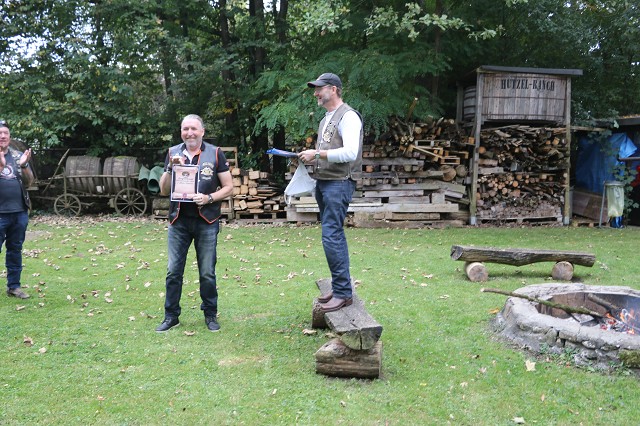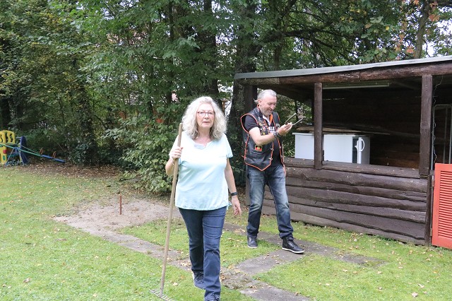 Jetzt wurde es ernst. Da wir diesen Wettbewerb nur einmal im Jahr zum 03.10. durchführen, gab es erst einmal eine Runde mit Probewürfen. Jedes Member versuchte sich daran, mit 24 Würfen eine möglichst hohe Punktzahl zu erreichen. Der Refree vom Reutlinger Countryclub zählte die Punkte zusammen und gab diese an den Schriftführer weiter. Um Punkte zu bekommen zählt der Abstand vom Stab, ob das Hufeisen Kontakt zum Stab hat oder diesen ganz umschließt.