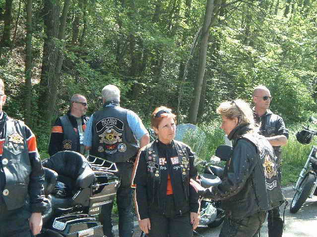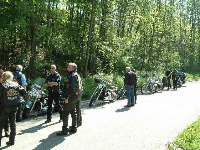 Kurz nach Sinsheim kommen uns innerhalb weniger Kilometer 4 Bikes samt Fahrer abhanden. Die beiden Nicht-Rulamänner aus Ludwigsburg hängen sich ab und fahren auf eigene Faust weiter. Ein paar Kilometer weiter streikt ein Fahrzeug – Elektrikprobleme! Der Pannendienst bringt Fahrer, Sozia und Bike sicher nach Korntal. Die Pause nutzt ein weiters Pärchen zum Umdrehen – der Fahrer der Heritage hat aufgrund einer Grippe nicht mehr die Energie zum Weiterfahren und macht sich ebenfalls auf den Heimweg über die Autobahn – eine kluge Entscheidung, wie er beim nächsten Stammtisch berichtet.