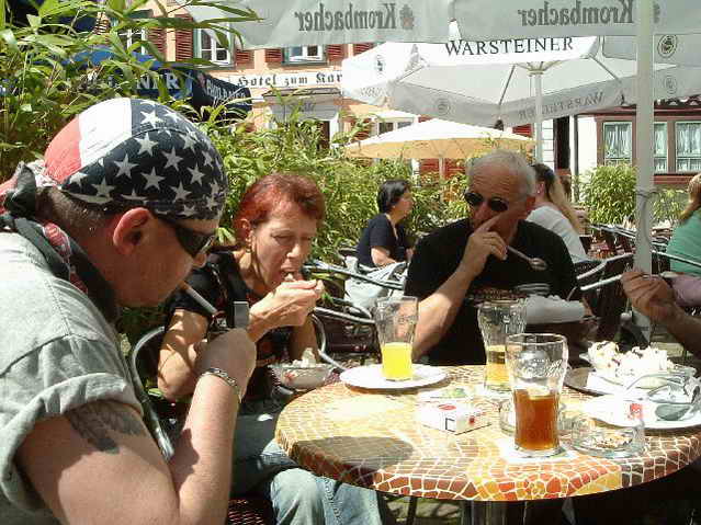Der Rest fährt weiter durch den Naturpark Neckartal/Odenwald nach Eberbach. Dort, am Neckar, an der Schiffsanlegestelle, parkt die Gruppe ihre Harleys. Ein kurzer Fussmarsch in die historische Altstadt zu einem uns wohlbekannten Cafe. Dort gibt es ausgezeichneten Kuchen und hervorragendes Eis, was angesichts der inzwischen angestiegenen Temperaturen genau passt. Noch ein bisschen die Sonne geniessen – und schon geht’s weiter.