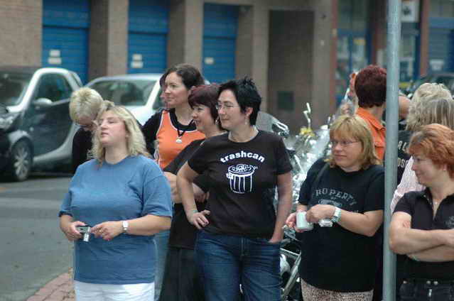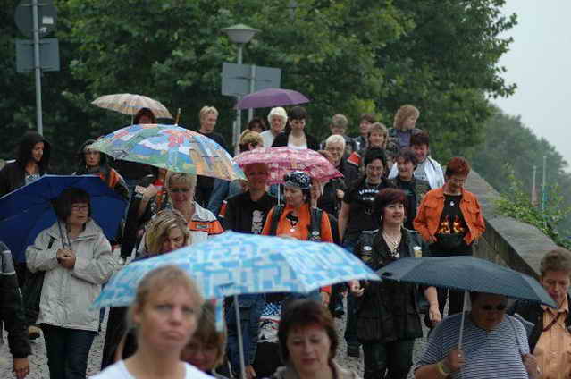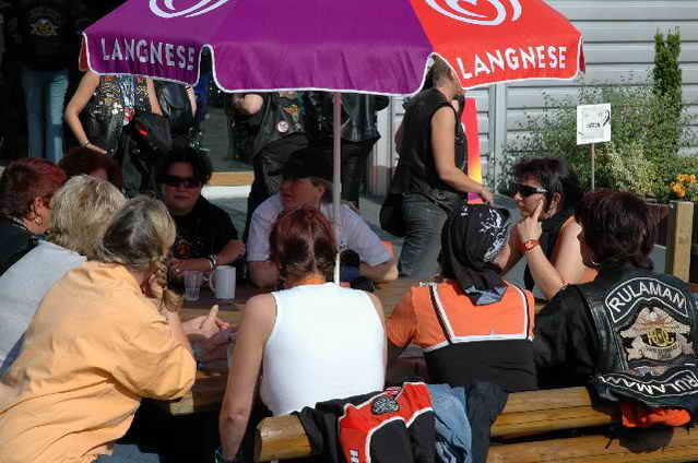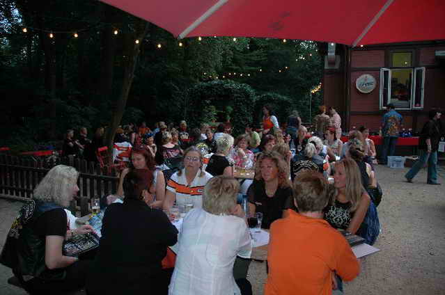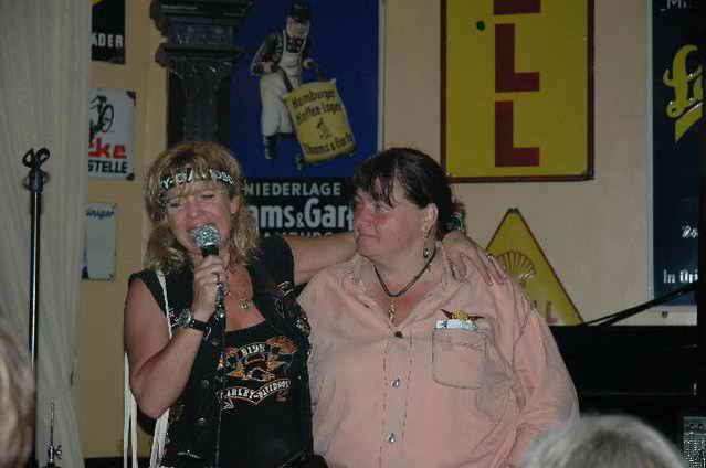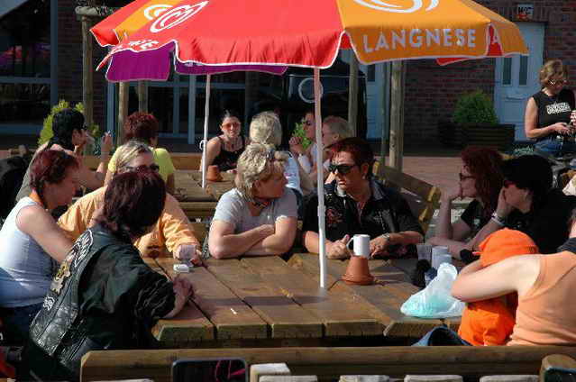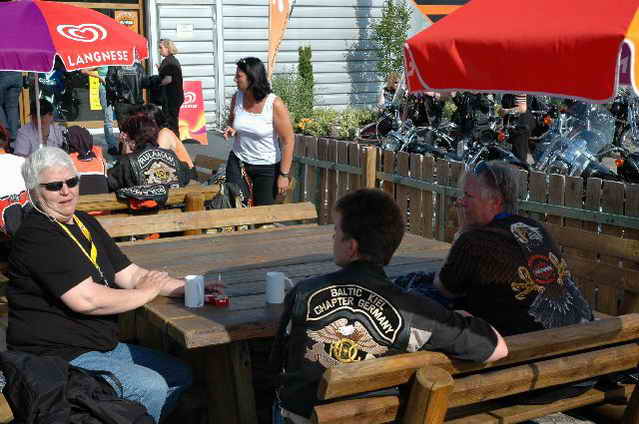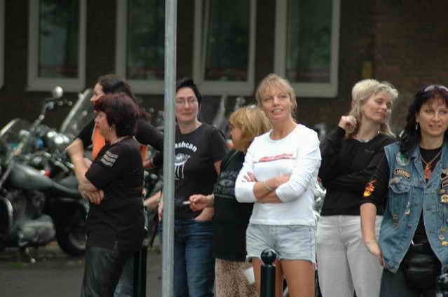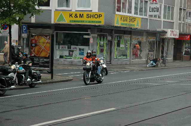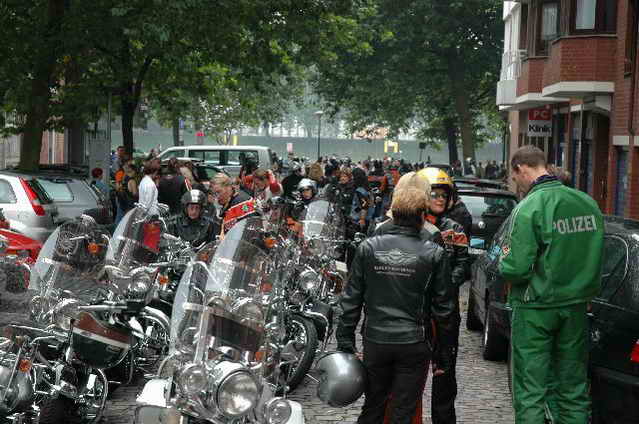 Wieder aufsitzen und zurück, denn um 18.oo Uhr fährt die Straßenbahn mit 1 x umsteigen, was für uns schon fast zum Problem wurde, - zur Party in die Waldschänke. Super Biergarten, super Stimmung und die Durchsage, dass sämtliche Getränke, außer Schnaps, bis 24 Uhr frei seien, was natürlich die Stimmung weiter anheizte. 30 Min. später die ersten Regentropfen. Alles rein ins Lokal, wo die Rock’n Roll-Band sich tierisch freute, dass nun alle drinnen nen Platz suchten. Dann ging’s los, tanzen bis zum Abwinken, denn die Band spielte fast ohne Unterbrechung bis zum Umfallen, gegen Schluss mussten sie sich noch die Hosen festhalten, so waren die Mädels drauf. Denke, die könnten sich mit den Monroes locker anlegen. Ach ja, hätt ich fast vergessen, Helga und Dieter waren privat an diesem WoEnde ebenfalls in Bremen, sind wegen uns extra mit dem Moped gefahren und haben Rulaman mit ihrer Anwesenheit unterstützt. Dieter durfte natürlich nur unter unserem Schutz das Lokal betreten, ansonsten hielt er sich draußen unter einem Sonnen- bzw. an diesem Abend als Regenschirm umfunktioniert, auf. Aber so ist das halt bei einem LOH-Treffen. Gell Dieter! Die letzte Bahn fuhr dann um 01.17 Uhr zurück, wieder mit umsteigen. Am Samstag war dann Brauerei Beck’s im Schnelldurchgang angesagt und um 12.oo Uhr Aufstellung zur Parade.