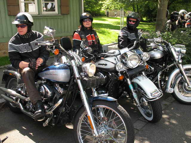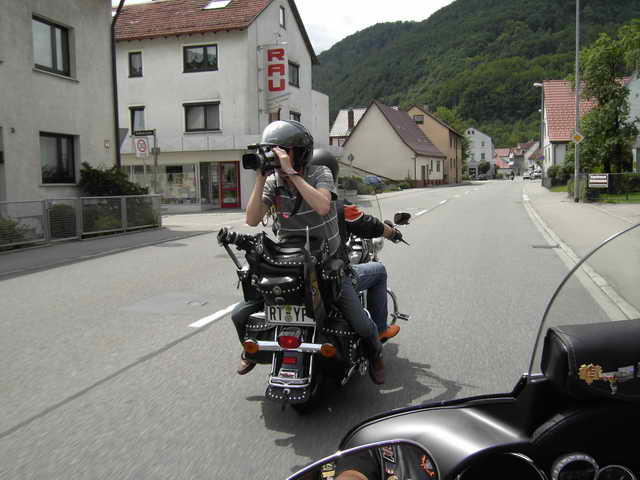 Auch hier hieß es wieder Bahn frei für die Rulas bis zur Dorfmitte, wo wir mitten im Geschehen des Albvereinfestes unsere Harleys unterhalb der Kirche abstellten. Schnell waren wir von neugierigen, begeisterten Festbesuchern umringt. Die Abspannszenen wurden letztlich vor dem Kleinengstinger Rathaus abgedreht. Nachdem nun drohende Regenwolken den Himmel abgedunkelt hatten ging es in zügiger Fahrt die neue B 312 durch den Tunnel zurück zum Südbahnhof Reutlingen. Raimund immer noch verkehrt auf dem Bike.