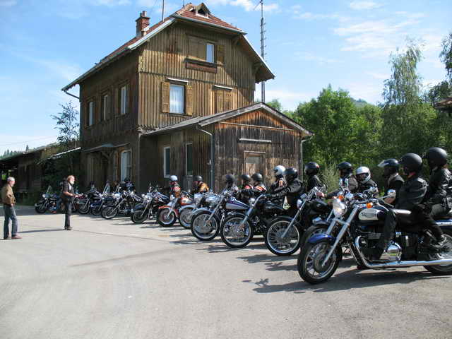 Wow, welch toll renoviertes Gebäude. Der um etwa 1895 im damals typischen Chalettstil gebaute Bahnhof sieht aus, als stände er kurz vor der Eröffnung. Kompliment an den Förderverein der Eisenbahnfreunde für den Lohn ihrer Arbeit. On the Road again zum Honauer Freibad. Hier dachten einige Badegäste im falschen Film zu sein, als plötzlich 20 vorwiegend schwarz gekleidete Biker sich über die Liegewiese direkt zum Schwimmerbecken machten. Auf dem Sprungturm stehend machte Kameramann Raimund effektvolle Aufnahmen aus der Vogelperspektive, Rulas unterhalb des Lichtensteins.