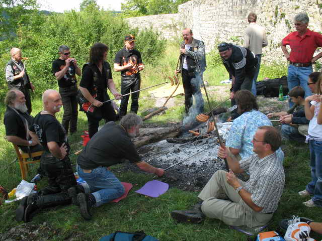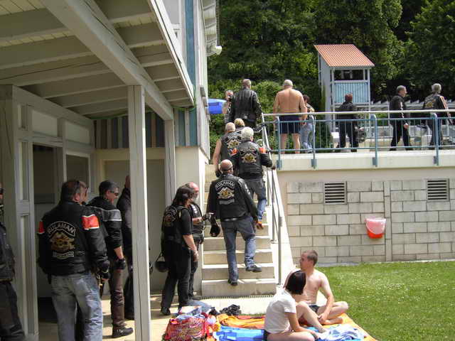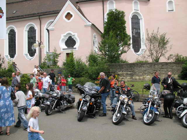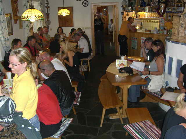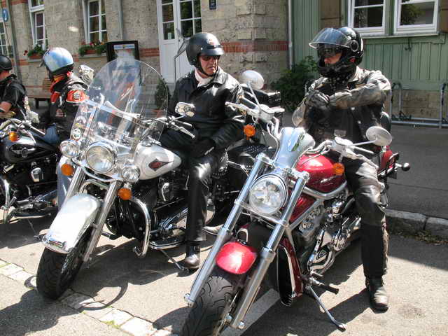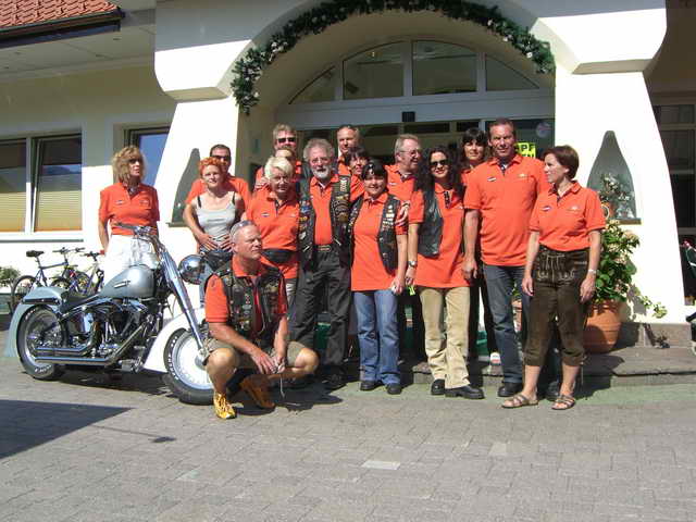Donnerstag, 7.30 Uhr, Treffpunkt CPO, standen pünktlich 14 RULAS mit Ihren 11 Harley’s in den Startlöchern. Donnerstag muss von Donner kommen. Um 8 Uhr konnte man den Donner von 11 Harley’s schon von weitem hören die sich auf machten , ca. 520 Km der Sonne entgegen, nach Südosten, über Bad-Urach auf der Landstraße Richtung Ulm. Hinter Feldstetten an der Abbiegung nach Merklingen stießen Claus-Peter und Ilona Hahn zu uns und Martin und Conny Mehl verabschiedeten sich , denn sie fuhren den direkten Weg über die Autobahn, sie hatten unterwegs noch eine geschäftliche Verabredung.Wir fuhren durch Ulm und um Ulm herum und mit Vollgas auf der B 7. Ausfahrt Mittelberg über Pfronten Richtung Reute. Nach Reute ging es links durch herrliche Landschaft am Plansee vorbei über den Ammersattel, Linderhof, an Garmisch-Partenkirchen vorbei Richtung Mittenwald. Die Temperaturen stiegen von Stunde zu Stunde und es war sehr schwer den Members den Sprung uns kühle Nass des Plansee’s zu untersagen. Vor Mittenwald in Klais war dann der Spaß vorbei, denn Axel meinte“ Vier Stunden auf dem Bock und immer noch kein Kaffee“ zwang die Truppe spontan zu einer Mittagspause.