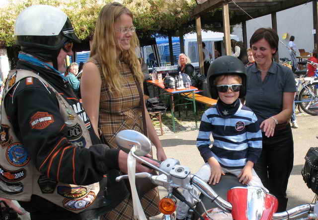 Der Part, den Rulaman dazu beiträgt, gewinnt Jahr für Jahr mehr Freunde und ist zwischenzeitlich zur Haupt-Attraktion geworden. Harley-Rundfahrten für Jung und Alt. Gegen einen Spendenbetrag in die Gemeindekasse, konnte man als Sozius mit routinierten Bikern und Bikerinnen eine Runde durch Tübingens Südstadt fahren.