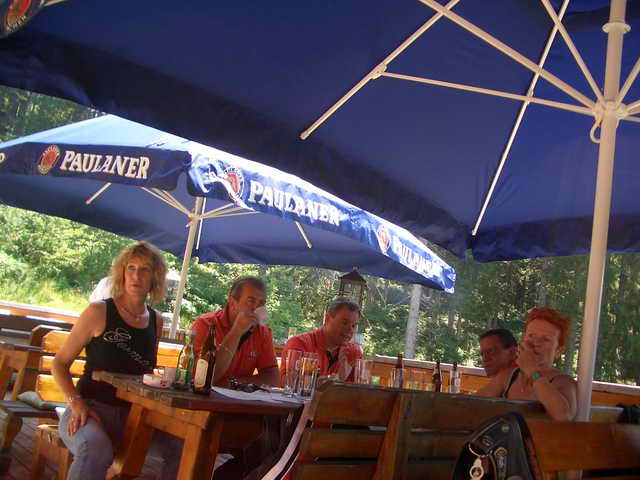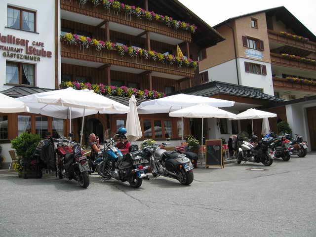 Donnerstag, 7.30 Uhr, Treffpunkt CPO, standen pünktlich 14 RULAS mit Ihren 11 Harley’s in den Startlöchern. Donnerstag muss von Donner kommen. Um 8 Uhr konnte man den Donner von 11 Harley’s schon von weitem hören die sich auf machten , ca. 520 Km der Sonne entgegen, nach Südosten, über Bad-Urach auf der Landstraße Richtung Ulm. Hinter Feldstetten an der Abbiegung nach Merklingen stießen Claus-Peter und Ilona Hahn zu uns und Martin und Conny Mehl verabschiedeten sich , denn sie fuhren den direkten Weg über die Autobahn, sie hatten unterwegs noch eine geschäftliche Verabredung.Wir fuhren durch Ulm und um Ulm herum und mit Vollgas auf der B 7. Ausfahrt Mittelberg über Pfronten Richtung Reute. Nach Reute ging es links durch herrliche Landschaft am Plansee vorbei über den Ammersattel, Linderhof, an Garmisch-Partenkirchen vorbei Richtung Mittenwald. Die Temperaturen stiegen von Stunde zu Stunde und es war sehr schwer den Members den Sprung uns kühle Nass des Plansee’s zu untersagen. Vor Mittenwald in Klais war dann der Spaß vorbei, denn Axel meinte“ Vier Stunden auf dem Bock und immer noch kein Kaffee“ zwang die Truppe spontan zu einer Mittagspause.