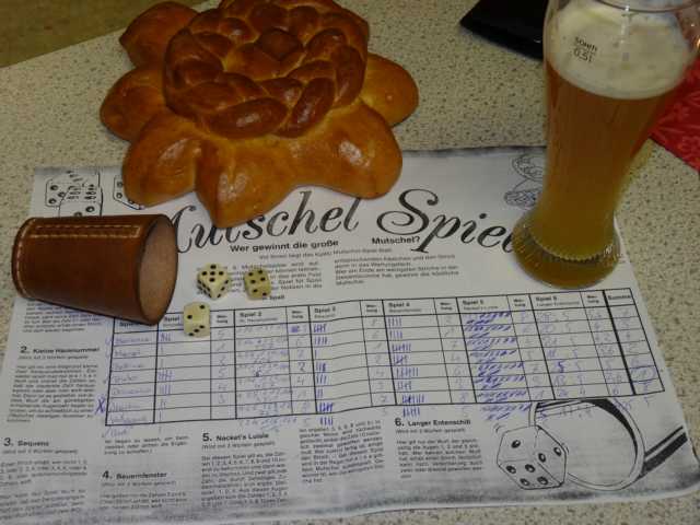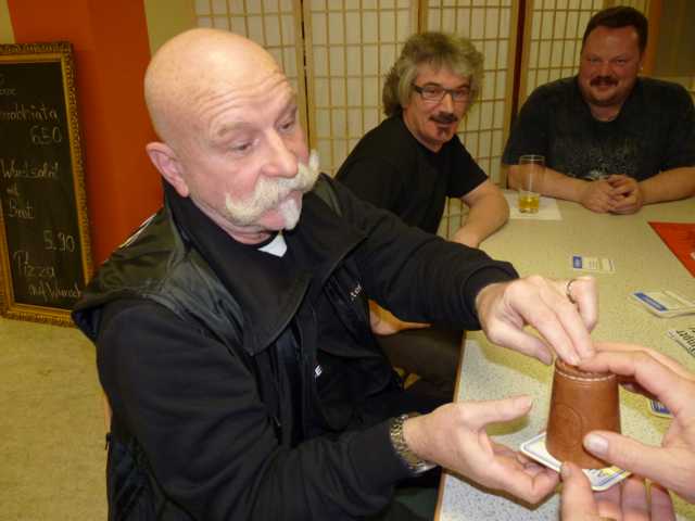 In drei Gruppen ging es hoch her - mehr Gruppen gab es nicht. Nachdem Motto: Lerne deine wahren Freunde kennen, gab jeder was der Würfel-becher her gab und Schadenfreude, diese Tugend, nein die gibt´s nicht wirklich bei den Rula´s – dachte ich bis zu diesem Abend. In der Endrunde saßen sich Dieter, Martin und Paul gegenüber. H1 gab den dreien Spiel und Regelwerk vor. Die verbliebenen Rula´s quittierten die Würfe mit „ooohhhh“s und „aaahhh“s anderen interessanten Fach-kommentaren. Eine Tendenz war erst gegen Ende der drei Runden zu erkennen und die vierte war die letzte und entscheidende Runde in der sich Martin klar von seinen beiden Mitspielern absetzen konnte. Kaum war der letzte Würfel gefallen, wurde Martin Mehl auch schon zum Mutschelkönig 2010 gekürt.