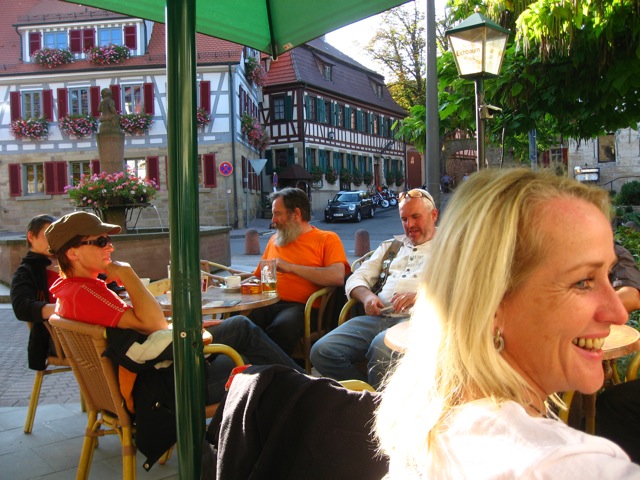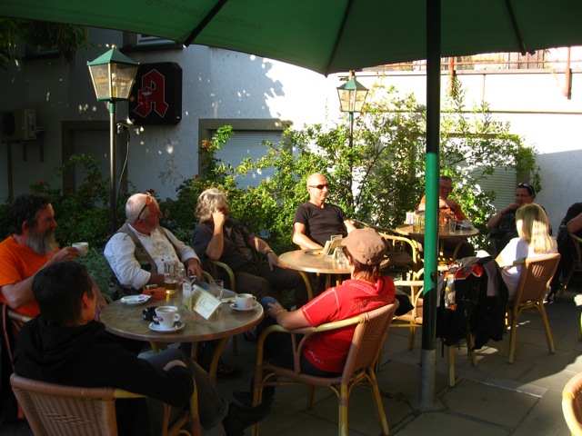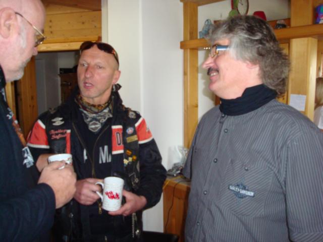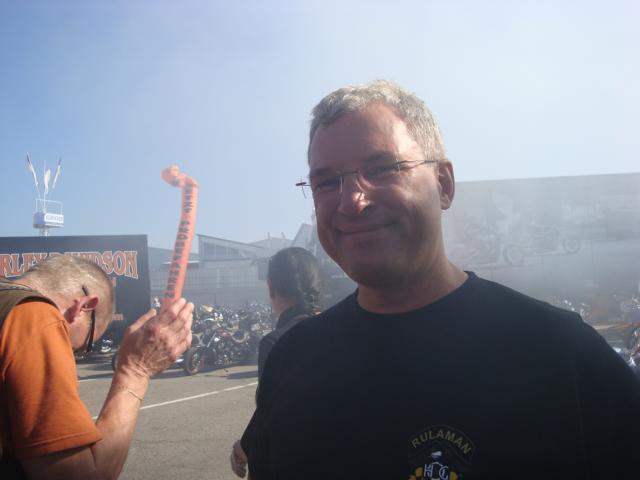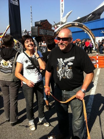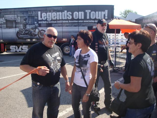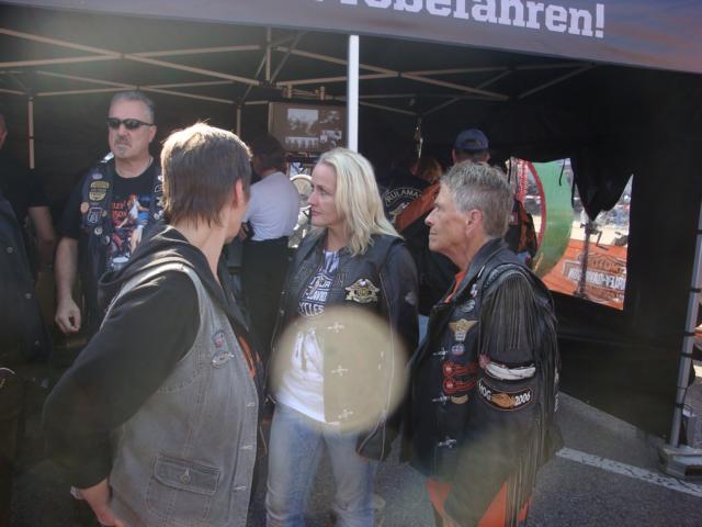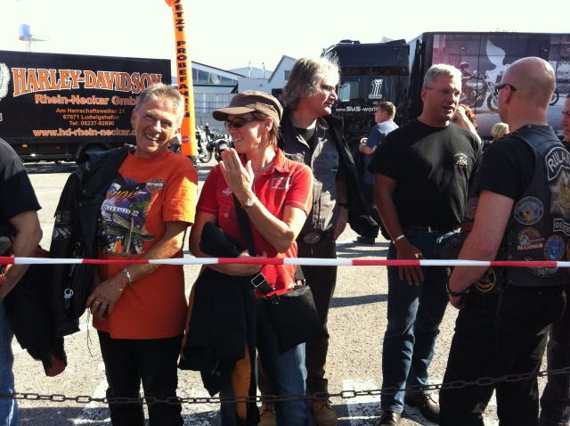 Die Familie von Klaus begrüßte uns recht herzlich und lud uns zum Kaffee ein. Auch ein alter Bekannter (ihr erkennt ihn sicherlich auf den Bildern) war mit von der Partie.Danach ging es los. Über Bietigheim, Besigheim und Lauffen fuhren wir durch das wunderschöne Kraichgau nach Sinsheim. Je näher wir nach Sinsheim kamen, desto mehr Harley-Fahrer waren auf den Straßen zu sehen.Auf dem Festgelände angekommen, machten beim Harley Demo-Ride Truck ein paar Member gleich eine Probefahrt klar.