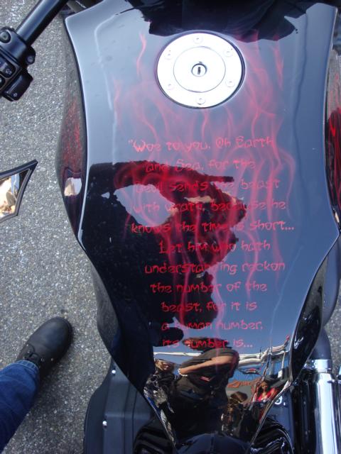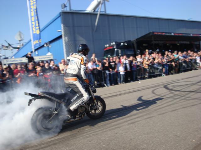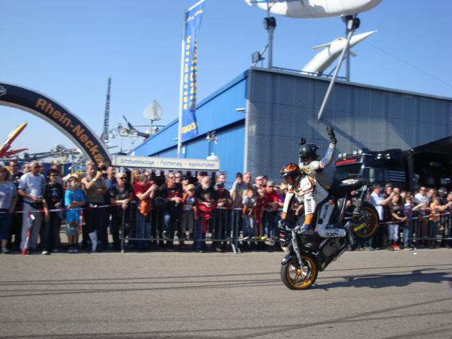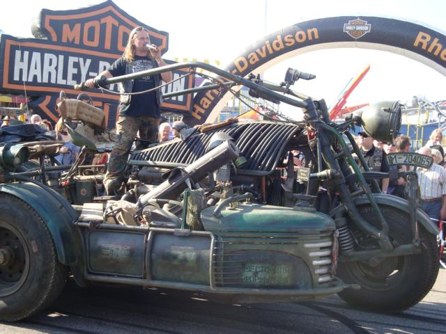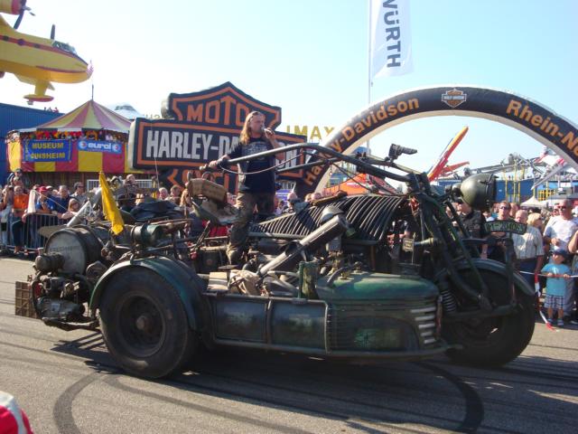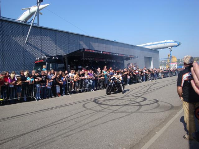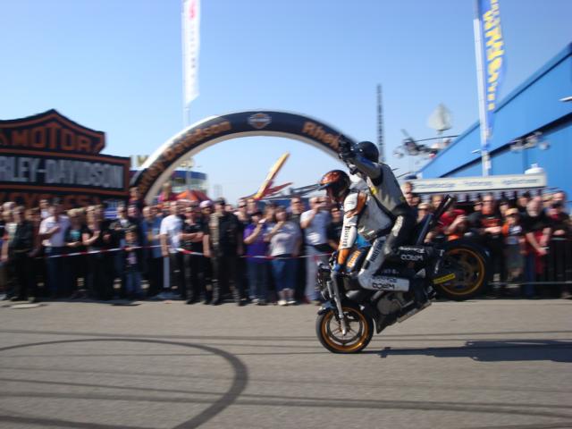 Gemütlich schlenderten wir an den vielen Ständen vorbei und ließen uns von den tollen Bikes inspirieren, was man über den Winter noch um- und anbauen könnte. Auf dem Festgelände trafen wir noch unseren Vice, der gerade vom Direktorentreffen in Fulda zurückkam.Ein Highlight war die Rainer Schwarz Stuntshow. Der Mann hat seine Bikes wirklich im Griff. Ich habe die Show jetzt schon mehrmals gesehen und bin immer noch begeistert. Für mich heist es üben und nochmals üben, damit ich das in der nächsten Saison so oder ähnlich hinbekomme (ok - war ein Spass). Danach wurde das grösste Motorrad der Welt von der Harzer Bike Schmiede vorgestellt. Das Ding fährt tatsächlich - mit einem Panzermotor. Die Show, bis sich dieses Ungetüm bewegte war nett anzusehen. Eines ist sicher: vom Harz sind die Jungs bestimmt nicht mit diesem Motorrad nach Sinsheim gefahren.