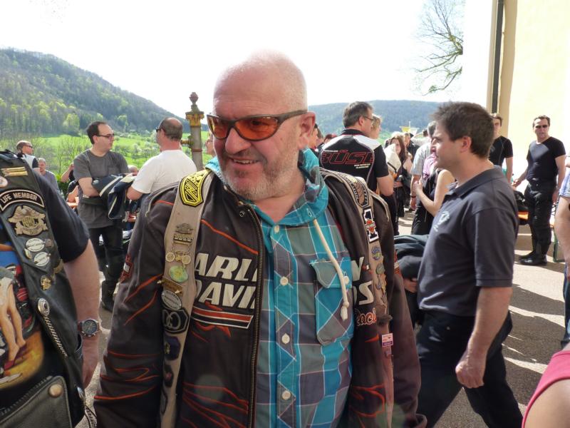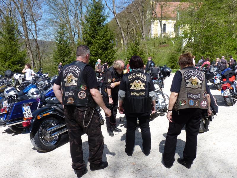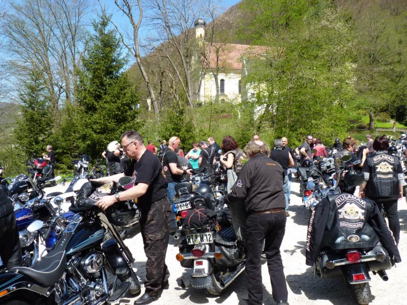 Der große Parkplatz unterhalb der Kirche war schon gut gefüllt, als wir ankamen. Nach einer halben Stunden startete die Ausfahrt. Gudrun zählte ca. 400 Motorräder, die bei der Ausfahrt mitfuhren. Wir fuhren auf kleinen Nebenstraßen der schwäbischen Alb rund um Deggingen. Dass die Bikesegung schon Tradition hatte merkte man unter andrem daran, dass sich Groß und Klein am Straßenrand versammelte und den beifahrenden Motorradfahrern zuwinkte.