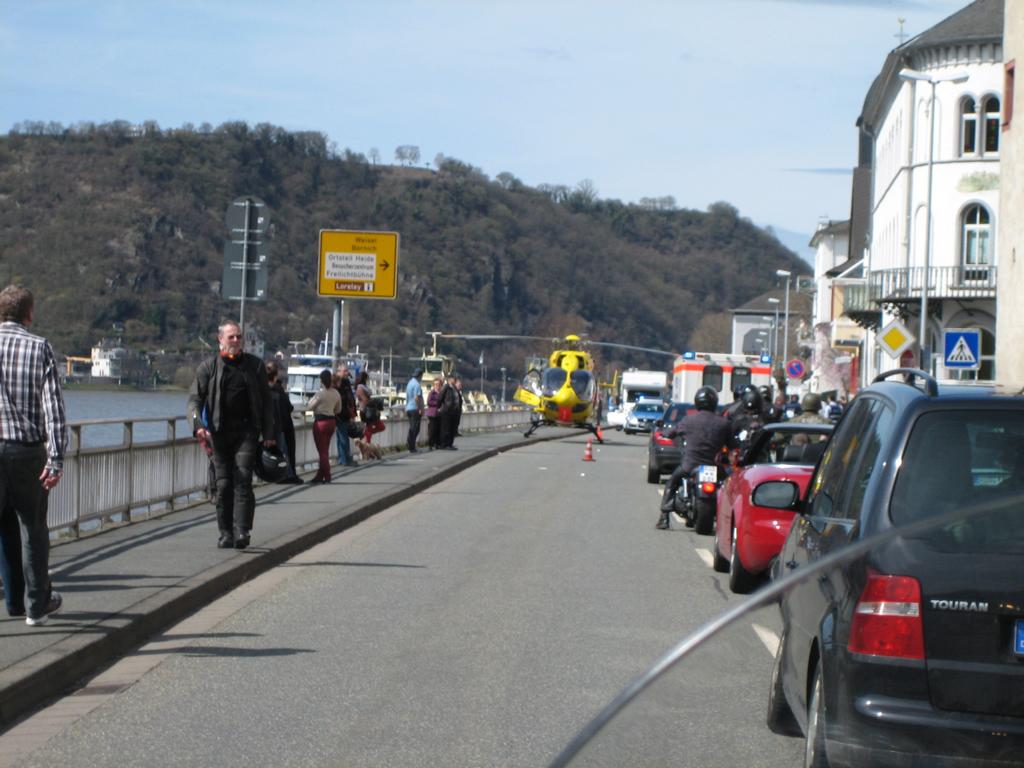 Es hätte also ein schöner Tag sein könne, wenn, ja wenn nicht, wie immer, ein paar Motorradfahrer (Raser) diesen Tag wieder für Ihr Ego benutzt hätten. Für einen von diesen (Fahrer und Beifahrer) war in St. Goar an der Fährabfahrt nach St. Goarshausen bzw. hinter der Abfahrt auf das Loreley Plateau Ende. (siehe Bild mit Rettungshubschrauber, Rettungswagen und Polizeifahrzeugen) Wir beide, fahren nunmehr knapp 40 Jahre ununterbrochen Motorrad, haben daran viel Freude, aber immer mehr fahren, als wenn es kein Morgen gibt. Schade!!!!!!!!!!!!!