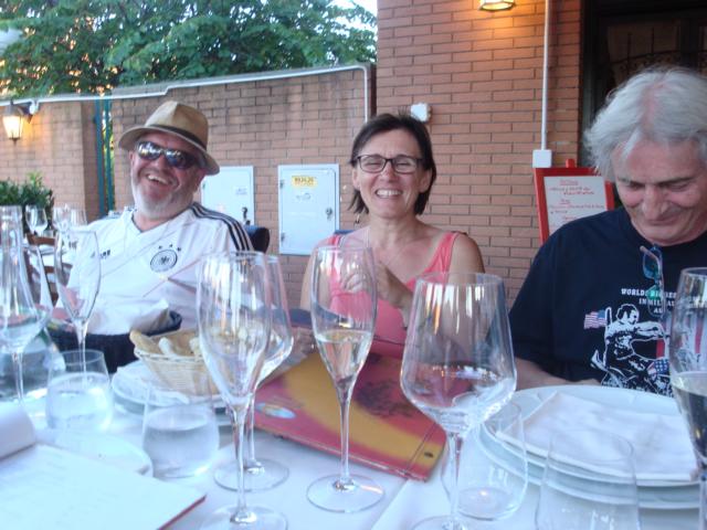 Die anderen Rulas mit den Mehls, Angie, Axel, Gerd und Thomas, ein Bekannter von Axel, trafen am Spätnachmittag in der Nähe von Ostia (ca. 25 km von Rom) ein, wo sich das Eventgelände befand. Nach einigem telefonischen Hin- und Her fand ich die Gruppe und wir nahmen ein gemeinsames Abendessen ein. Leider hatten sie nicht so viel Glück mit dem Wetter und mussten bei strömenden Regen fahren. Aufgrund des schlechten Wetters und Öl auf der Straße ereigneten sich 2 kleine Unfälle, wobei Gerd aufgrund des Unfalls unterwegs noch an der Hand genäht werden musste.