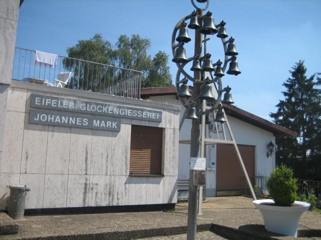 Von hier geht’s zur Glockengießerei Mack nach Brockscheid; am Sonntag zwar geschlossen, sonst kann man den Betrieb auch besichtigen (haben wir schon gemacht und es ist höchst empfehlenswert), aber auch von außen gibt es einiges zu sehen. Diese Gießerei ist seit dem 16. Jahrhundert tätig und hat fast alle Glocken in den Kirchen und Rathäusern etc. im Rheinland gefertigt. (siehe Bilder)